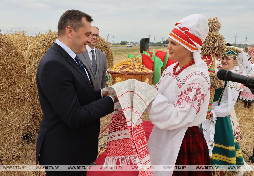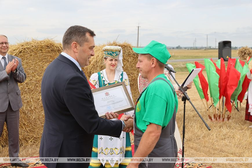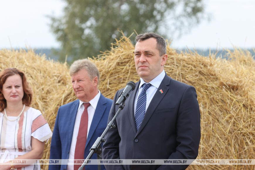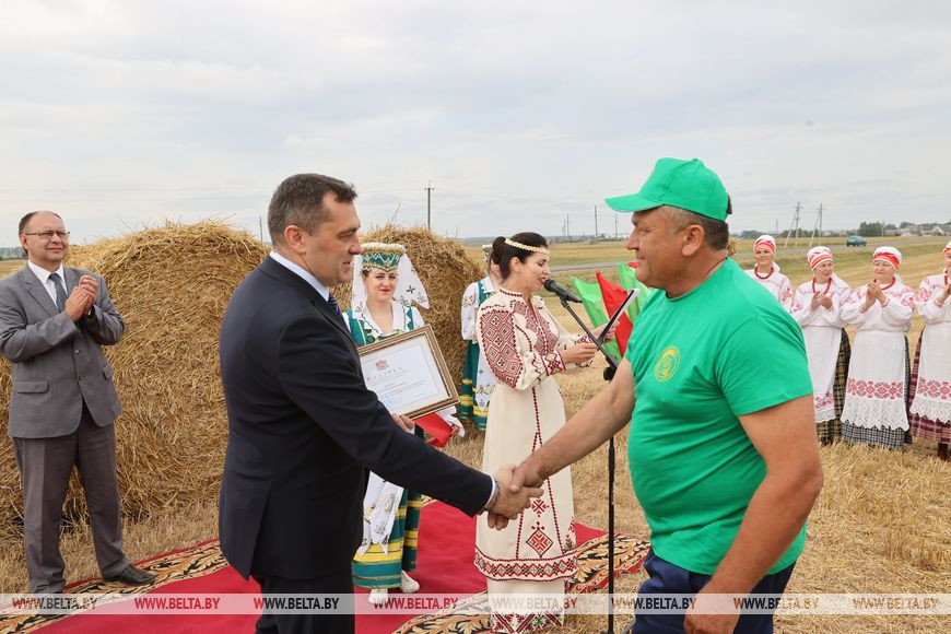 30 августа, Дубровенский район /Алеся Пушнякова - БЕЛТА/. За урожаем в 1 млн тонн зерна, которые собрали аграрии Витебской области, стоит огромный труд людей. Такое мнение высказал на церемонии чествования хлеборобов в Дубровенском районе, где сжали миллионную тонну зерна, председатель облисполкома Александр Субботин, передает корреспондент БЕЛТА.