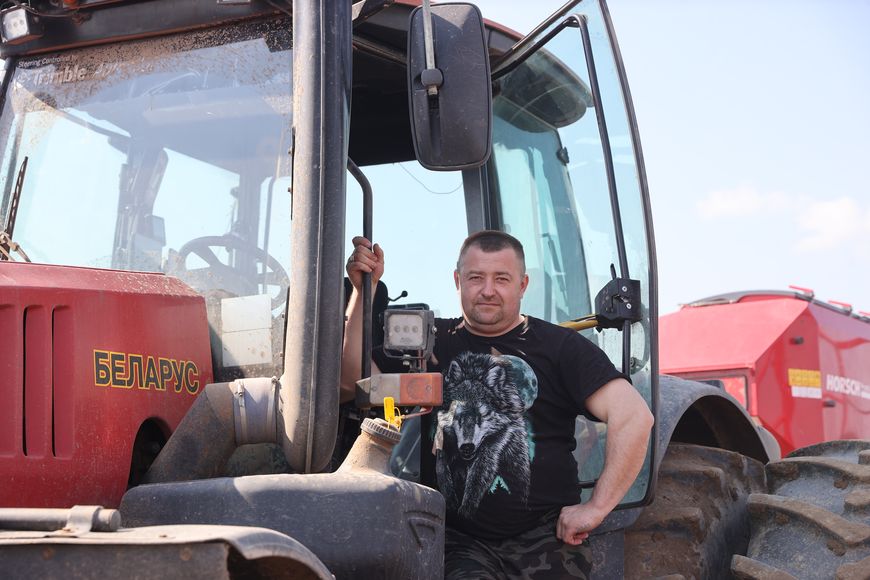 В поле работает энергонасыщенный трактор под управлением Александра Бурака. На несколько минут техника замирает - в сеялку отправляется очередная партия семян. Во время паузы механизатор рассказывает: