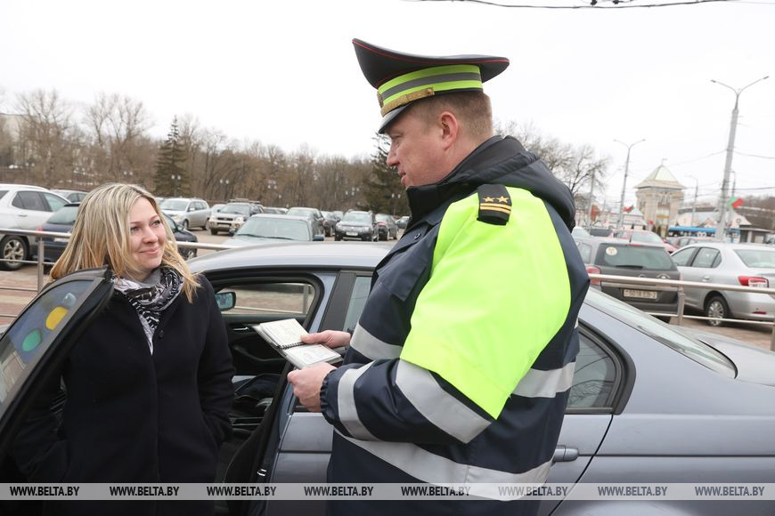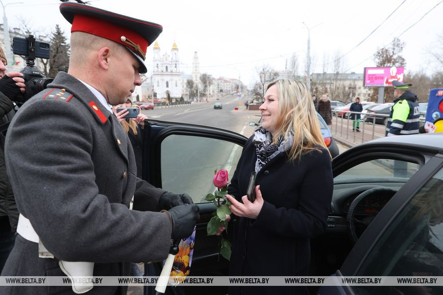 4 марта, Витебск /Алеся Пушнякова - БЕЛТА/. В День милиции работники УГАИ УВД Витебского облисполкома вышли на улицы, чтобы поздравить женщин с их предстоящим праздником и вручить им цветы и памятные сувениры, передает корреспондент БЕЛТА.