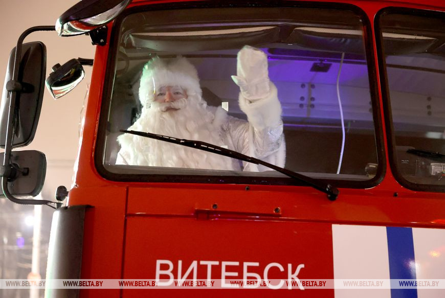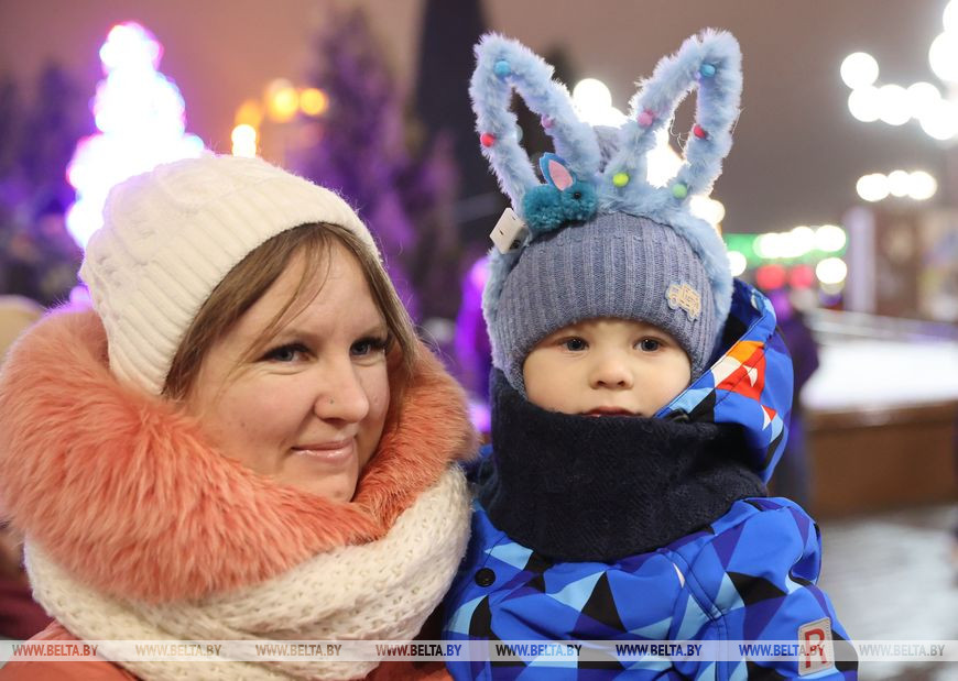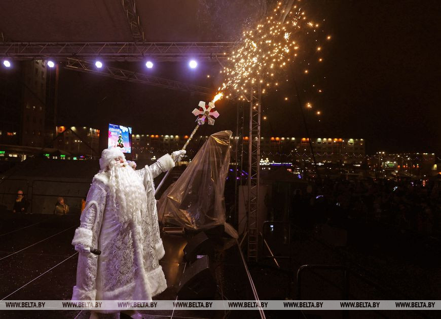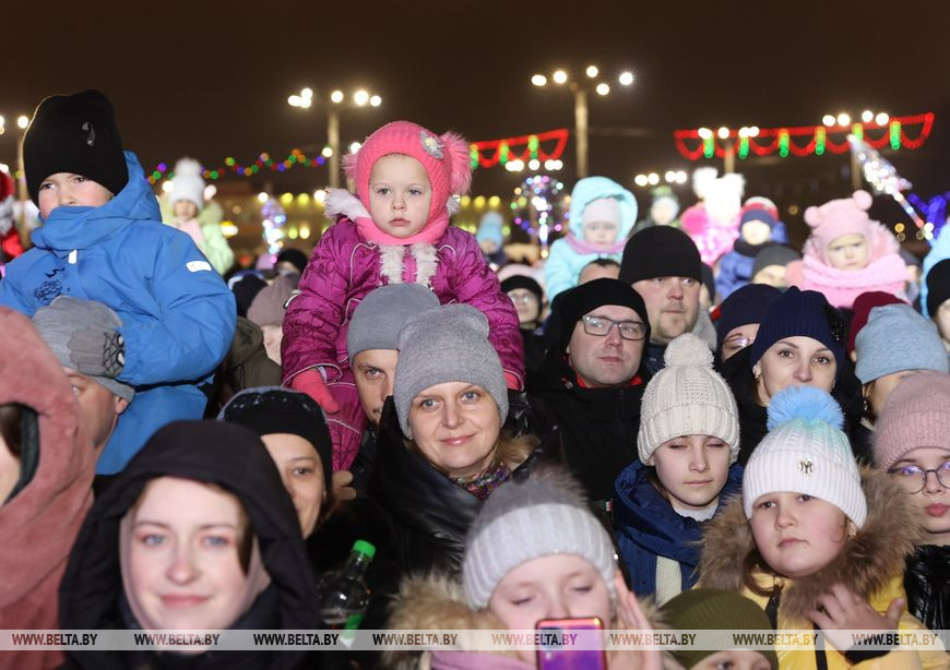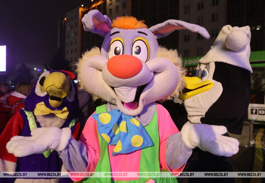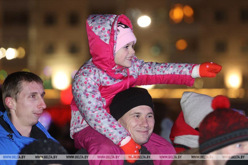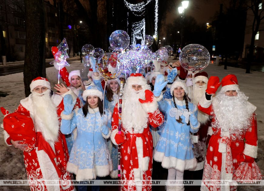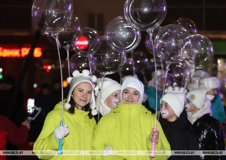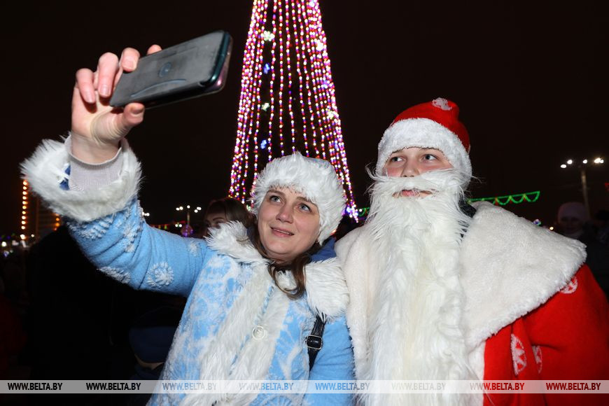 Встречали участников и гостей ростовые куклы и снежные символы наступающего года - зайцы. Малыши с охотой фотографировались с добродушными персонажами и пританцовывали под новогодние мотивы. Позже в сказку всех пригласили Снегурочка, Емеля и Баба-яга, а вместе со зрителями они принялись звать Деда Мороза. Главный волшебник эффектно появился прямо на пожарной машине и посетовал, что слишком торопился на праздник, превысил скорость и сани занесло в бурелом. За пожарной машиной следовали 110 пар Дедов Морозов и Снегурочек, которые ранее торжественно прошли по украшенному яркой иллюминацией скверу Богдана Хмельницкого. Фактически на празднике сбылась небольшая мечта работницы яслей-сада №12 Витебска Юлии Смирновой. Женщина с детства на Новый год исполняла роли Снежинки, была кошкой и Мальвиной, но вот Снегурочкой не доводилось. "Теперь получилась Снегурочка, впервые примерила этот костюм, образ. Как в детстве, мы должны верить в чудеса. И детям, и взрослым это необходимо, тем более под Новый год", - заверила она. Дед Мороз, в образе которого был Андрей Кимстач (также работник детского сада), отметил, что будет радовать мальчиков и девочек хорошим настроением, вокруг елки водить хороводы, петь, танцевать и дарить сказочную атмосферу. Силой мысли и слова сказочные персонажи и зрители зажгли огни на новогодней елке - радостные улыбки не сходили с лиц маленьких и взрослых витебчан.