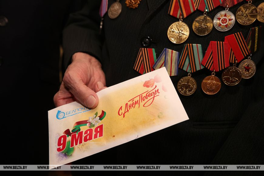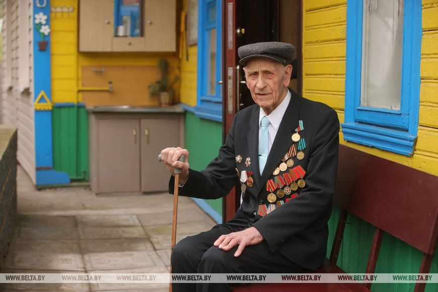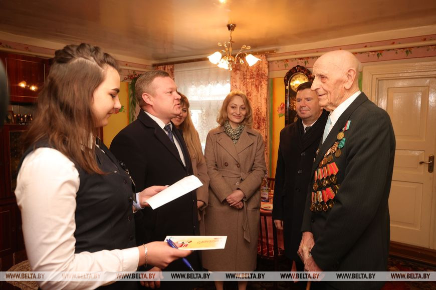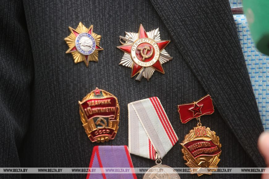 В преддверии Дня Победы Антон Антонович с большим энтузиазмом рассказывает о своем пути. Гости, к слову, пришли не с пустыми руками: они принесли подарки и материальную помощь ко Дню Победы, выплаты которой начались сегодня по всей Беларуси.