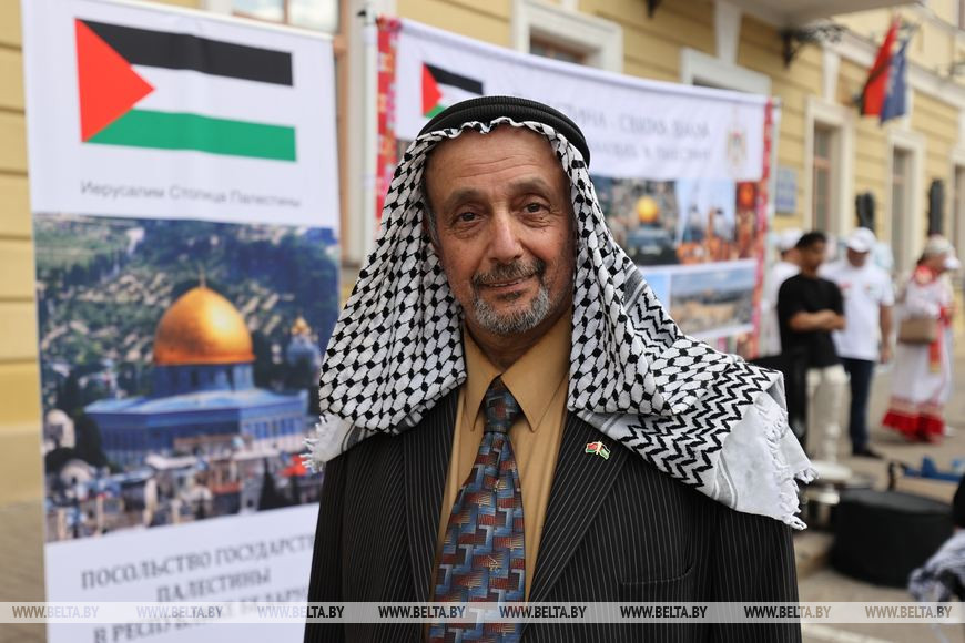 "Удивить минчан невозможно - минчане сами удивляют", - подметил бывший председатель палестинской общины в Беларуси Хассан Камаль Махмуд. Выставочная экспозиция Палестины привлекла нас своим колоритом. Очереди к ней не заканчивались. "Мы удивляем нашей культурой и особенно нашей кухней. Вот музыкальные инструменты, различные ручные изделия из оливкового дерева, в том числе карта Палестины, изделия из морских раков", - показал он.