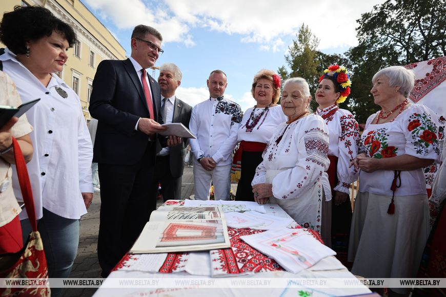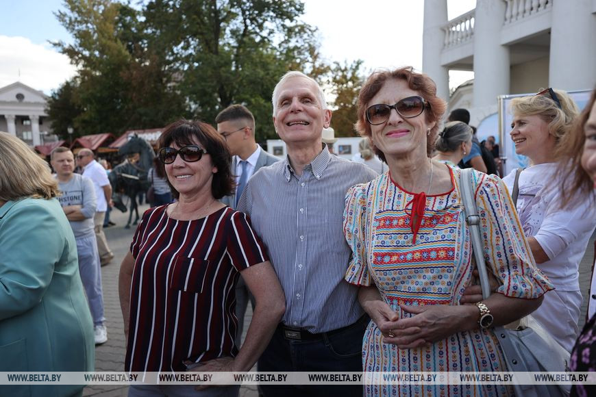 Фестиваль до официального старта посетили высокие гости. Мы заметили министра культуры Анатолия Маркевича и попросили поделиться личными впечатлениями. "Атмосфера царит просто незабываемая, потому что люди улыбаются, танцуют, рассказывают стихи и очень внимательно относятся один к другому. И это говорит о том, что в нашей Беларуси все живут дружно, мирно, несмотря на разные национальности", - заметил он.