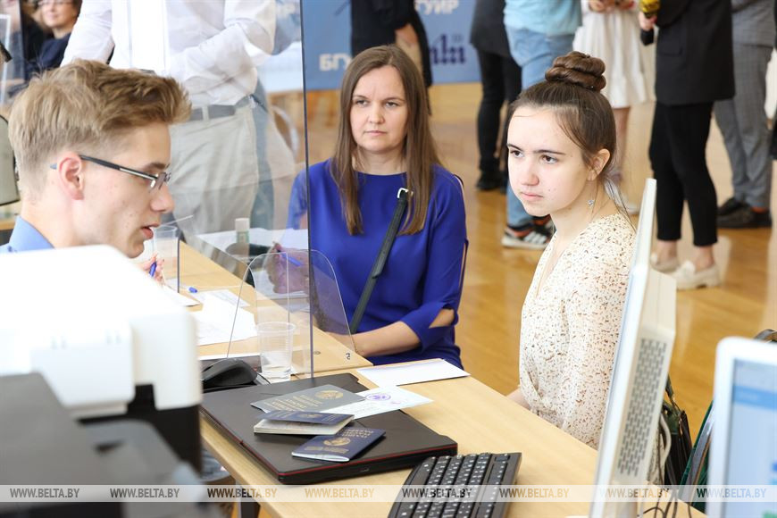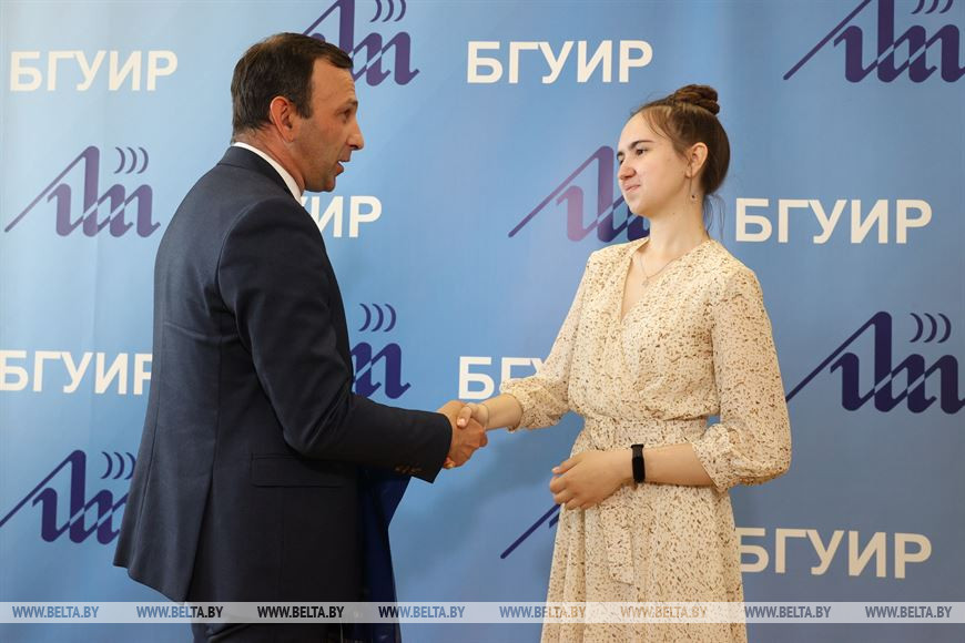19 июля, Минск /Корр. БЕЛТА/. Абитуриентка из Лиды Анастасия Бильдь с 400 баллами подала документы в Белорусский государственный университет информатики и радиоэлектроники на специальность "информатика и технологии программирования", ее приветствовал ректор вуза Вадим Богуш, передает корреспондент БЕЛТА.