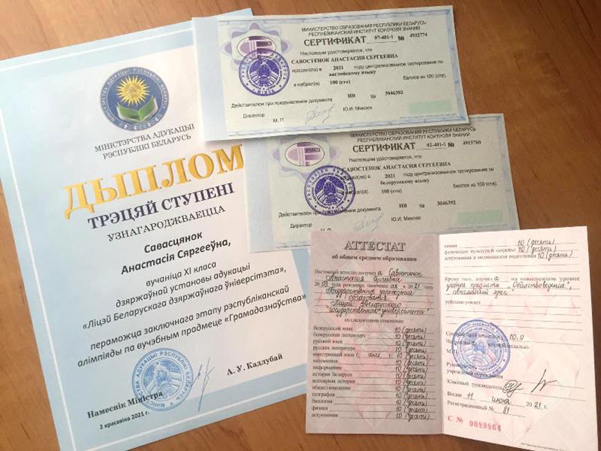 "Девушка набрала 400 баллов из 400 возможных. В "максимум" вошли результаты ЦТ по белорусскому и английскому языкам, средний балл аттестата и 100 баллов за победу на республиканской олимпиаде по обществоведению. Такого успеха Анастасия добилась без подготовки у репетиторов. Занималась самостоятельно и посещала факультативы по профильным предметам", - рассказали в пресс-службе.