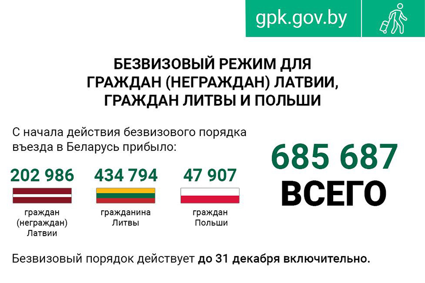 С 1 января в безвизовом порядке в Беларусь въехал 300 701 житель соседних стран ЕС. В том числе 186 531 гражданин Литвы, 67 535 граждан и 20 620 неграждан Латвии, а также 26 197 граждан Польши.