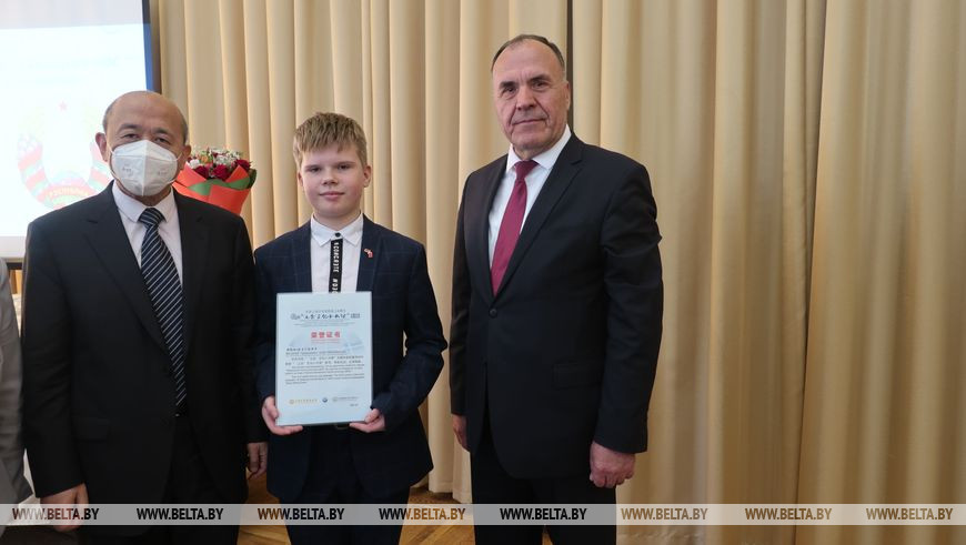 Почетную грамоту Шанхайской организации сотрудничества вручил победителю Чрезвычайный и Полномочный Посол КНР в Республике Беларусь Се Сяоюн, который пожелал юному китаеведу новых достижений.