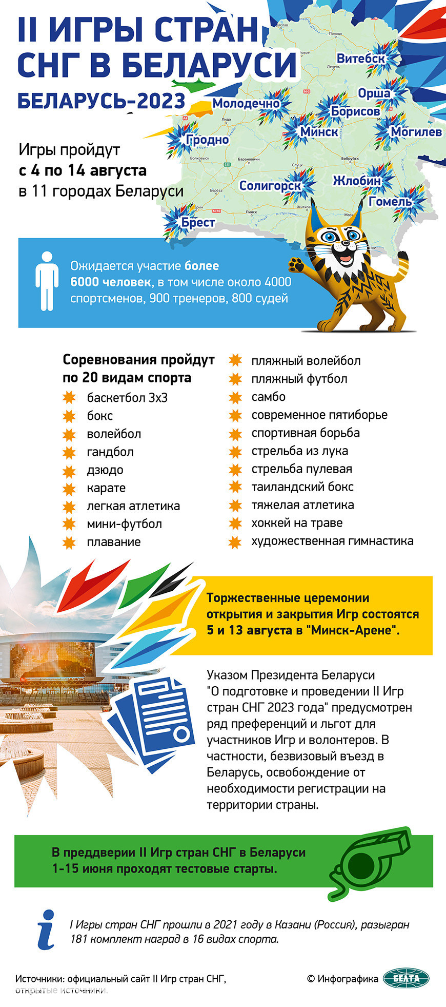 "На сегодняшний день идет брендирование городов. Каждый приезжающий в населенный пункт, в город, где будут проходить Игры, сразу окунется в эту атмосферу. Если мы берем Солигорск и Молодечно - это билборды, растяжки, ростовые фигуры. Они уже установлены. Каждый спортивный объект, общепит несет смысловую нагрузку II Игр стран СНГ. На сегодняшний день брендируются спортивные объекты. Это будет презентабельно и очень здорово. Фан-зоны, где можно сфотографироваться и на всю жизнь оставить для себя воспоминания об этих Играх", - рассказал Владимир Губаревич.