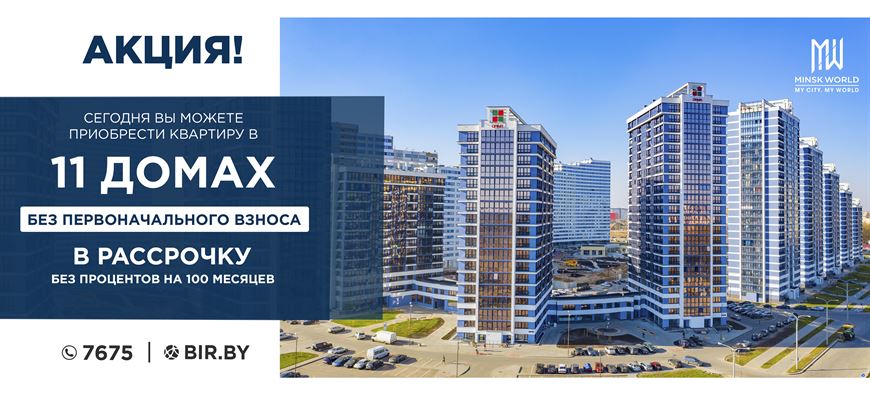 Более того, только сейчас квартиры в 11 домах комплекса Minsk World можно приобрести В БЕСПРОЦЕНТНУЮ РАССРОЧКУ НА 100 МЕСЯЦЕВ БЕЗ ПЕРВОНАЧАЛЬНОГО ВЗНОСА! Воспользуйтесь этой уникальной возможностью! Просто приходите в офис с паспортом – и приступайте к оформлению договора на приобретение квартиры в Минске!