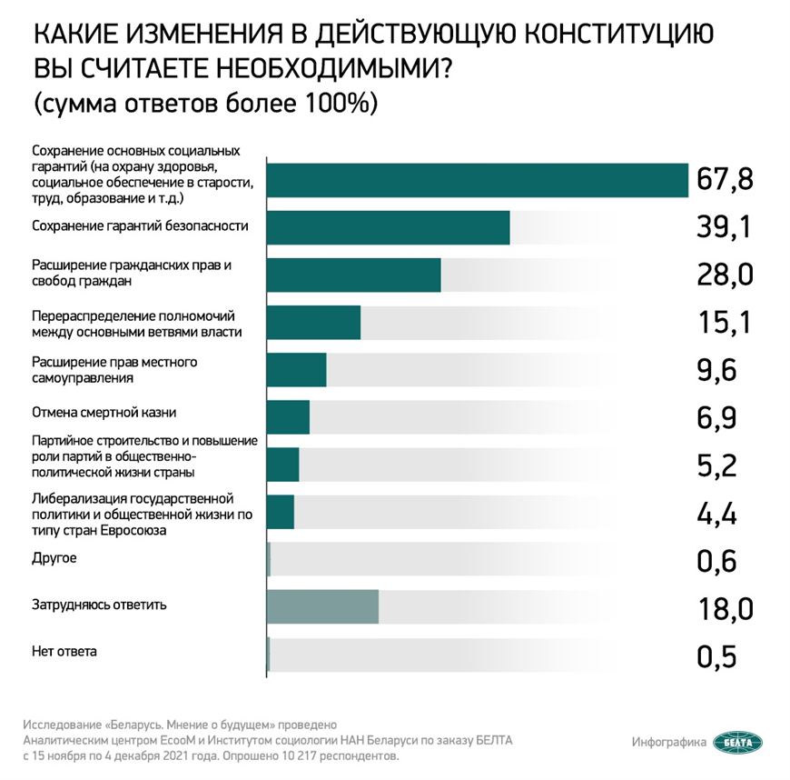 Если говорить о характере поправок в Конституцию, то наибольшей поддержкой пользуются вопросы сохранения социальных гарантий на охрану здоровья, пенсию, труд, образование (около 68%), которые с отрывом опережают гражданские и политические запросы. Среди последних - расширение прав местного самоуправления (около 9%), партийное строительство (около 5%) и либерализация общественной жизни (4%). Для социологов это любопытный результат попытки "цветной революции": наше общество в итоге подтолкнули к противоположному полюсу - к "замораживанию" запросов на политическую активность.