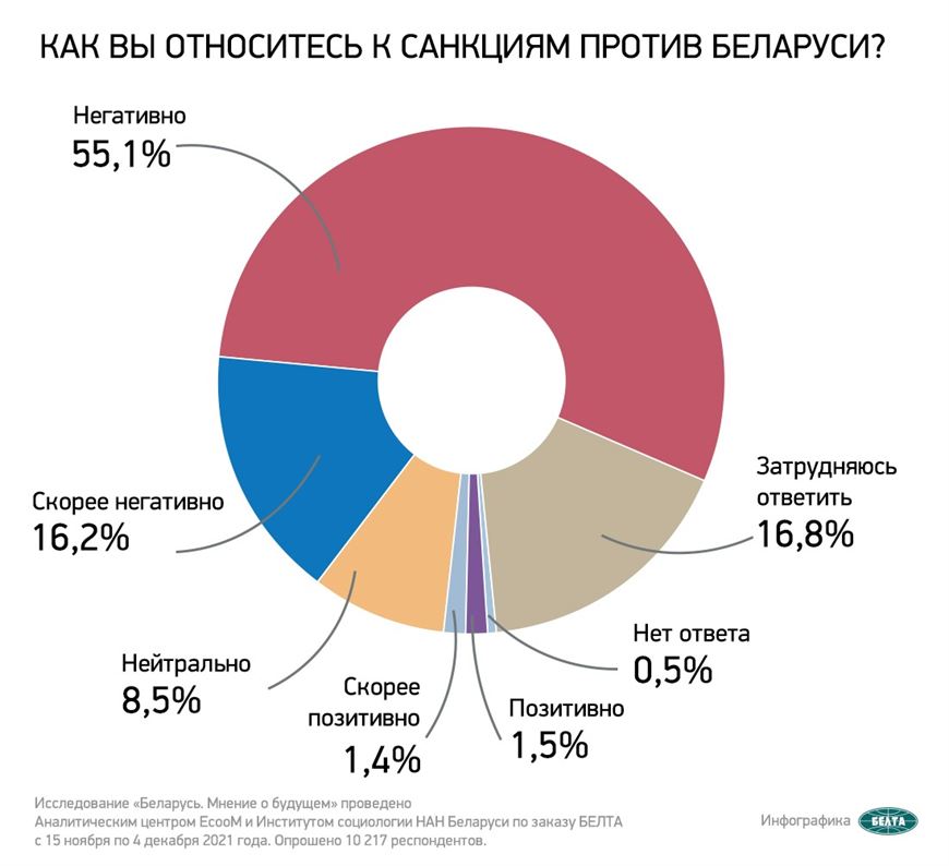 Еще один любопытный момент - анализ причин введения санкций с точки зрения населения. Вариант "озлобить народ против Президента" выбрало всего 19,1% респондентов, хотя по сути это открыто декларируемая политическая цель санкций. А такие не совсем очевидные ответы, как ухудшение уровня жизни, ограничение конкуренции, постановка страны в зависимое положение, заморозка интеграции с РФ, дипломатическое давление на Россию получили в совокупности более 60%. Это, в свою очередь, говорит о том, что наша пропаганда неплохо сработала в плане разъяснения причин и механизмов санкций. Все перечисленные мотивы имеют место быть, и это подтверждает высокую общественную поддержку новой нормы в УК, которая запрещает прямые призывы к санкциям. По сути, о поддержке такой нормы заявили более 70% опрошенных.