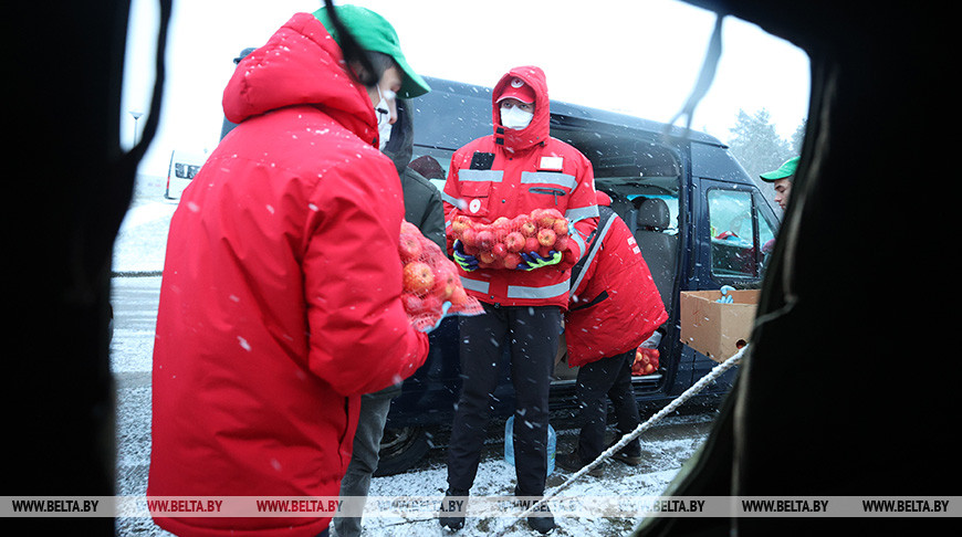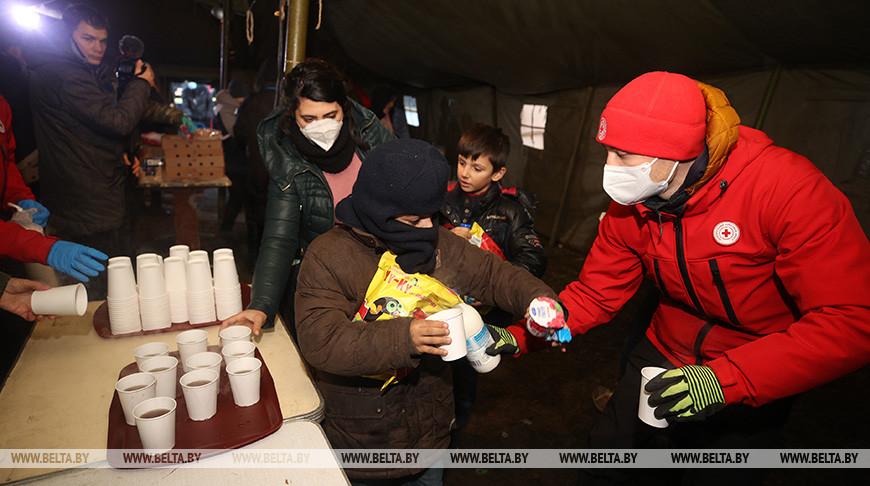 Сегодня идет 18-й день нахождения беженцев на белорусско-польской границе. К пункту их временного размещения ежедневно доставляется гуманитарная помощь, в том числе продукты питания, средства гигиены, теплая одежда.