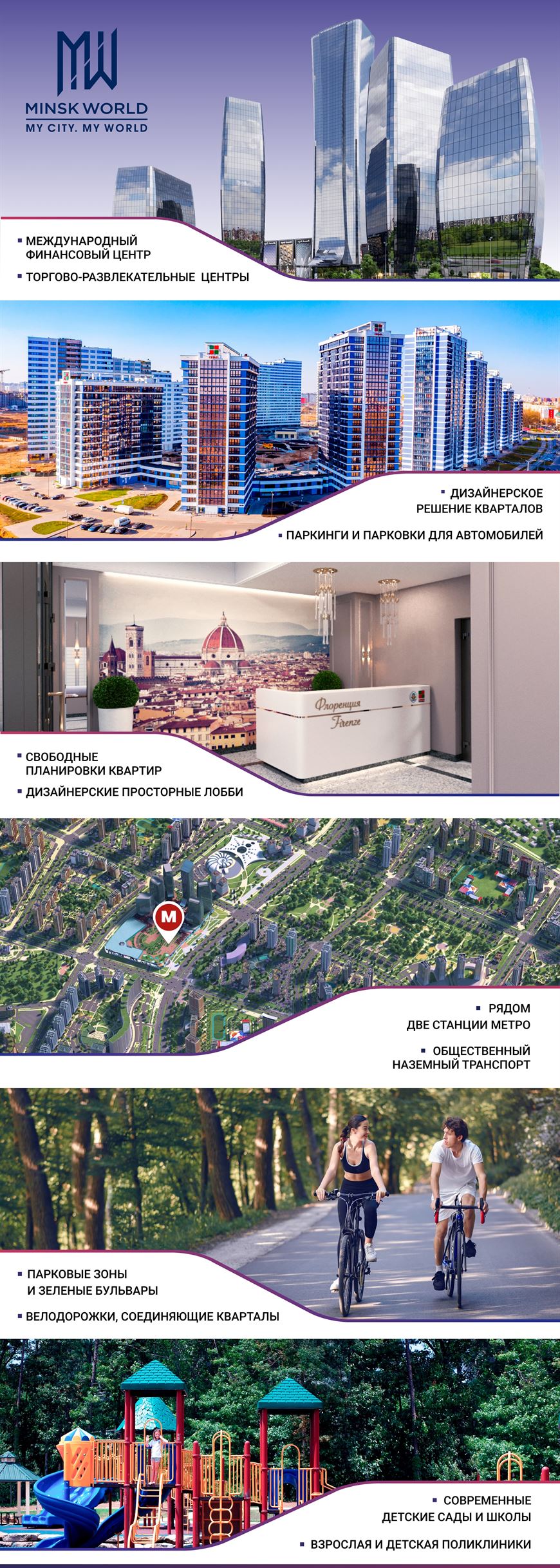 Международный финансовый центр и крупнейший торговый центр. Коммерческая недвижимость буквально в каждом квартале. Удобные открытые парковки и крытые паркинги. Новые станции метро. Кварталы свяжут велодорожки. А в центре разместится большой городской парк. В комплексе Minsk World будет все для вашей счастливой жизни и успешного бизнеса!