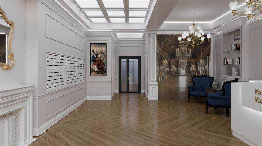 Лобби "Мазурка" выглядит более сдержанно, но в тоже время роскошно. Складывается ощущение, что попадаешь в гостиную XIX века, где совсем скоро пройдет бал.