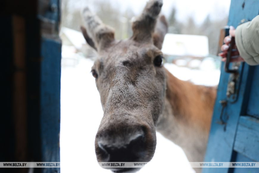 С Олегом мы встречаемся в Ивенце и вместе едем в сторону хутора, расположенного в самом сердце Налибокской пущи. Путь до него неблизкий - около 30 километров по заснеженной лесной дороге. Спустя примерно полчаса оказываемся на просторном дворе с небольшим аккуратным домиком и несколькими хозпостройками. Навстречу машинам сразу же выбегают овчарка, пара пушистых котов и... олень! По-хозяйски потрепав его по голове, Олег поясняет: