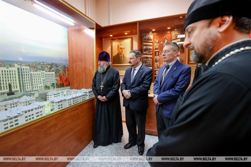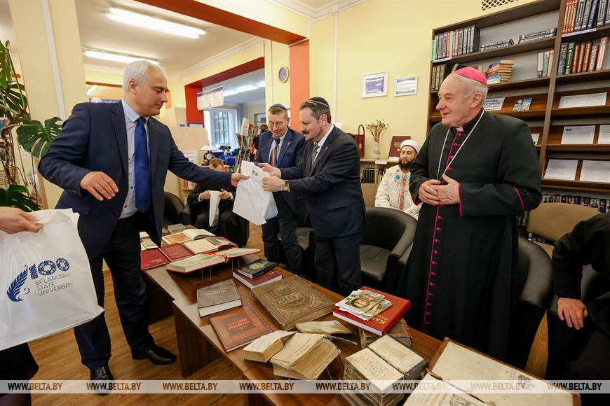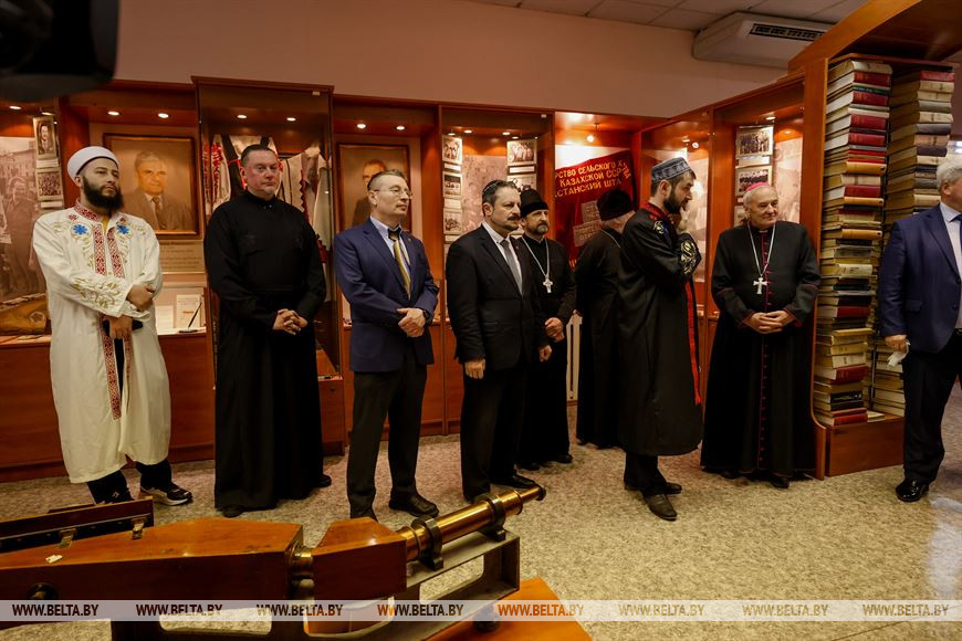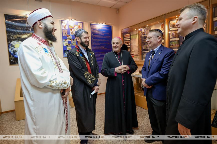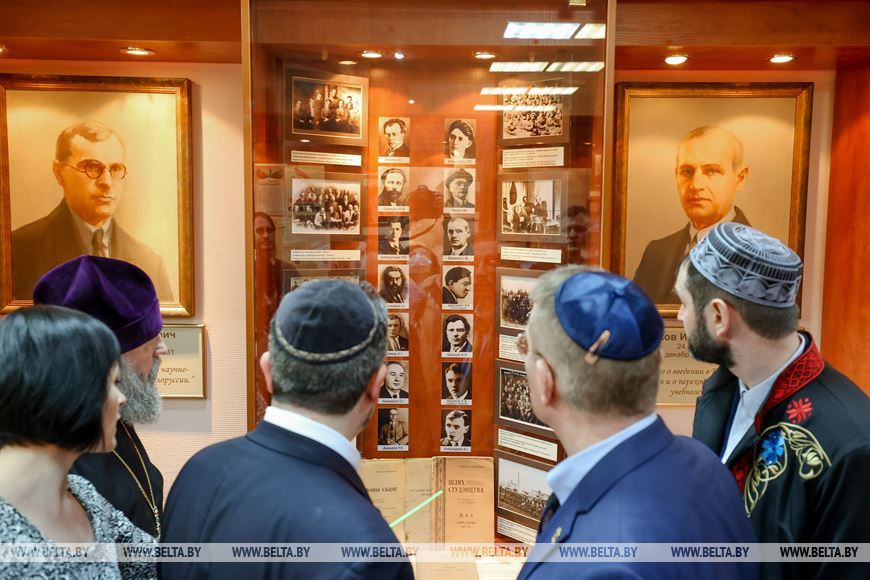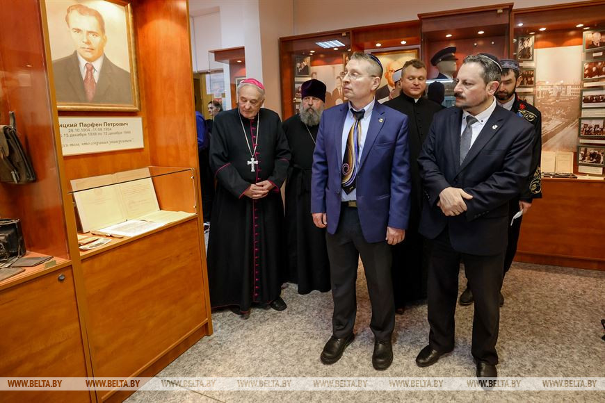 13 мая, Минск /Корр. БЕЛТА/. Это служители расположенных в Минске Соборной мечети, костела Матери Божьей Будславской, синагоги Бейс Исроэль, православного храма в честь иконы Божией Матери "Всех скорбящих Радость". Визит в БГУ прошел в рамках проекта "Год народного единства", который проводится в университете с марта текущего года. Представители конфессий встретились с руководством, преподавателями и студентами БГУ. Для гостей организовали экскурсионную программу. -0-