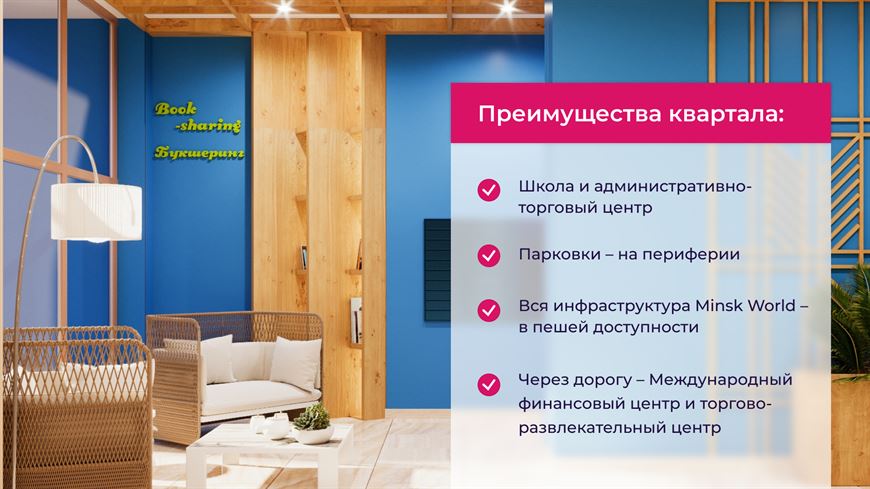 Девиз жителей Бора-Бора – "жизнь без лишних беспокойств" - с удовольствием позаимствуют и жильцы одноименного дома. Транспортная доступность и собственная инфраструктура, квартиры со свободной планировкой и панорамными окнами – вот основные характеристики новостройки. Забота о жильцах в Minsk World начинается на стадии планирования строительных работ, поэтому здесь будет удобно жить и работать, отдыхать и развлекаться, заниматься спортом и саморазвитием.