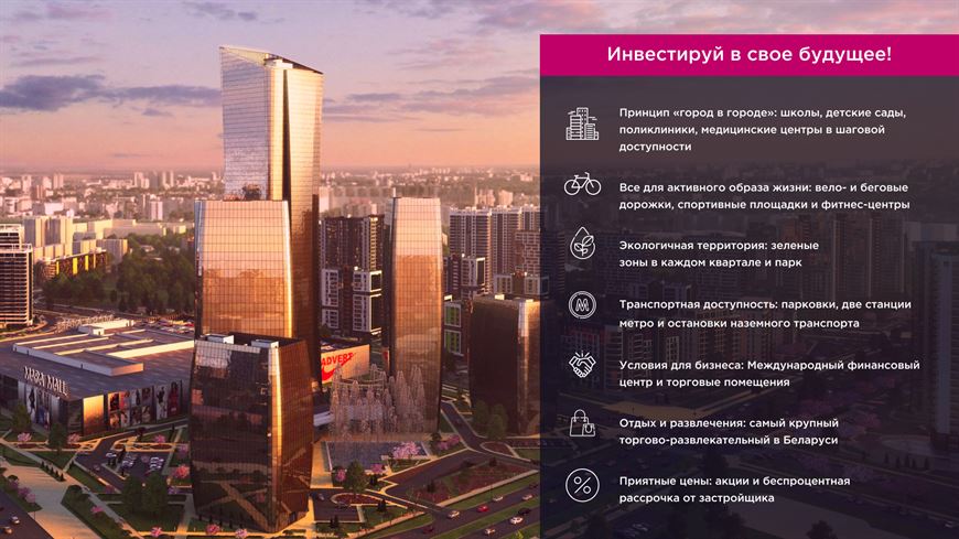 Многофункциональный комплекс Minsk World – не просто несколько жилых кварталов, а полноценная часть комфортной городской среды. Понятие "дом" здесь не ограничивается рамками квартиры или подъезда, а распространяется на каждый квартал и весь комплекс в целом. В любом уголке будет комфортно как дома.