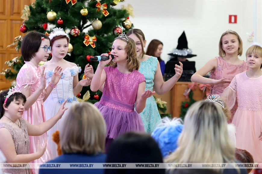 Ребята из Детского городка для гостей подготовили представление "Новый год в кругу друзей". Персонажами музыкальных и танцевальных номеров стали всем знакомые герои: Дед Мороз, Снегурочка, зайчики и мишки. Был даже символ наступающего года - дракон. "Ребята очень талантливые, все делали с душой. Пусть точно такие же улыбки, как были сегодня, будут у них на лице каждый день", - сказал министр.