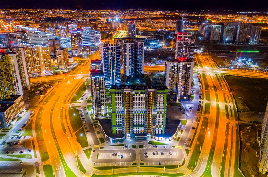 Поднимаясь в панорамном лифте, можно увидеть не только весь уникальный "15-минутный город" с высоты птичьего полета, но и обозреть центр Минска, до которого всего лишь 7 минут езды на автомобиле или общественном транспорте.