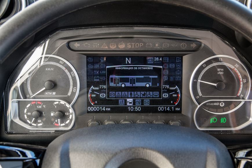 – Рабочее место полностью обновлено. Установлен мультируль, а к регулируемому сиденью при желании можно добавить и функцию памяти. Датчики температуры – как в салоне, так и в кабине – подадут сигналы для работы кондиционера: по сути, климат-контроль. К тому же предусмотрены датчики дождя и света. А главное – все, что отвечает за работу автобуса, отображено на панели. Водителю не нужно отвлекаться и выходить из кабины для проверки тех или иных систем, – говорит Владимир Дормаш.