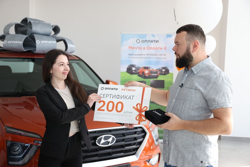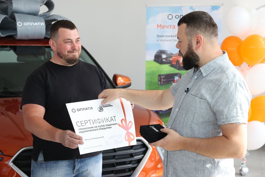 Партнeры мобильного сервиса вручили обладателю яркого кроссовера сертификат на 200 рублей от сети салонов умной техники "НА СВЯЗИ" и сертификат на нанесение на кузов защитного керамического покрытия от автомойки/детейлинг Le-mans.