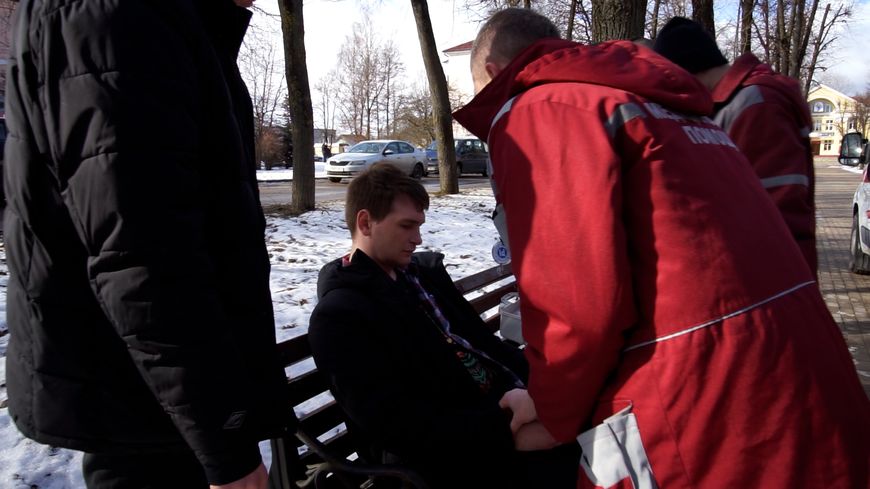 Еще немного - и реанимационная на дорожке сквера на улице Маркова. Подъезжает к скамейке, где полулежит бледный, как полотно, парень. Врач Сергей Кандыбо и два фельдшера - Денис Гончаров и Алексей Рудковский - подбегают к теряющему вновь сознание парню.