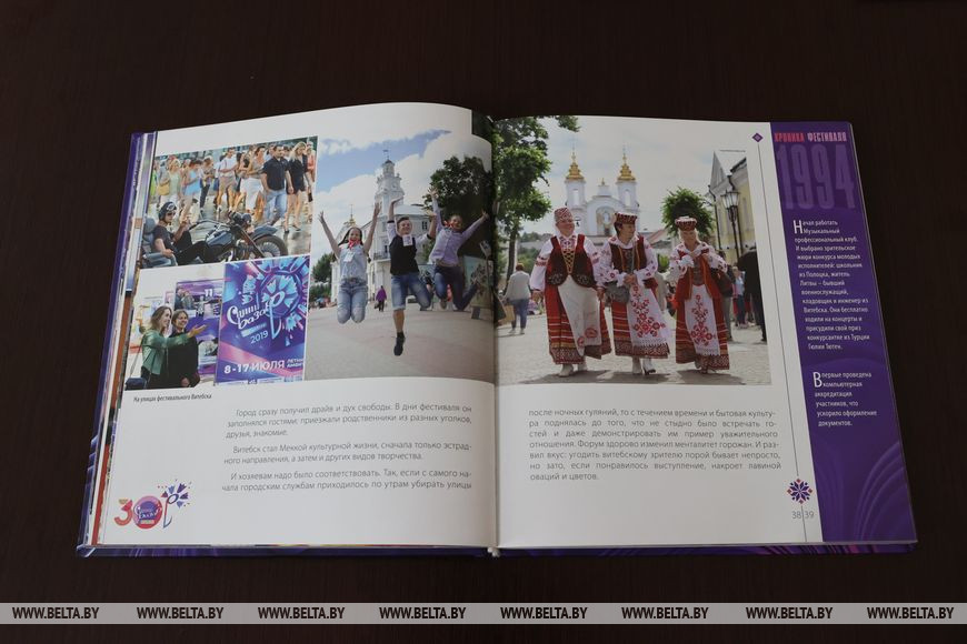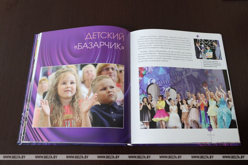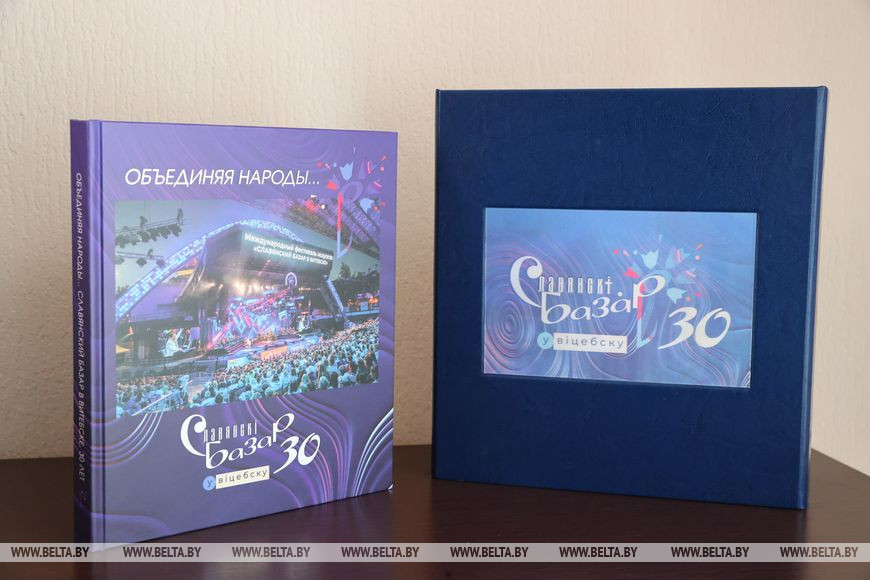 Издательский проект "Славянский базар в Витебске. 30 лет. Объединяя народы" осуществлен при поддержке Постоянного комитета Союзного государства и приурочен к 30-летию Международного фестиваля искусств "Славянский базар в Витебске". В фотоальбоме на 200 страницах представлен богатейший архивный фотоматериал, собранный фотографами Белорусского телеграфного агентства - порядка 400 иллюстраций. Эти фотографии в полной мере передают историю "Славянского базара", настроение фестивального Витебска, открывшего за три десятилетия многие имена теперь уже любимых исполнителей. Изданная книга - своеобразный портрет "Славянского базара" - каким он был, каким видится и какой сейчас. Тираж издания - 700 экземпляров.