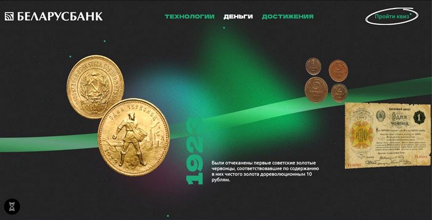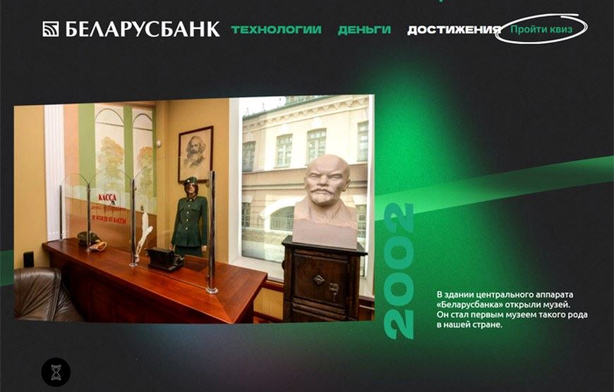 Завершается увлекательная экскурсия в разделе "квиз", где участнику предлагается ответить на вопросы. Нам удалось правильно ответить на 9 из 10. Не угадали лишь с годом установки первого отечественного банкомата. Хотите узнать, когда это произошло? Добро пожаловать на промо-сайт Беларусбанка, созданный в честь его 100-летия. Будет интересно!