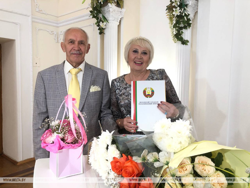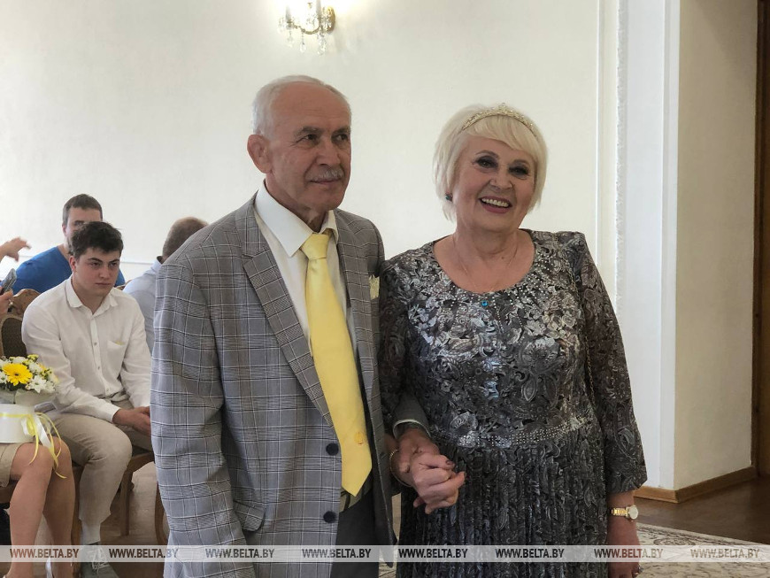 Спустя полвека совместной жизни супруги Владимир и Надежда Мельковы как никогда уверены, что любовь с годами никуда не уходит, а лишь разгорается с новой силой. В подтверждение - их крепкий семейный союз, проверенный на прочность несколькими десятилетиями. Все это время пара идет по жизненному пути рука об руку, поддерживая и помогая друг другу. Юбилей со дня свадьбы муж и жена встретили вместе с родными и близкими в отделе ЗАГС Могилевского горисполкома, где по этому случаю для них провели незабываемую торжественную церемонию. На праздник заглянула корреспондент БЕЛТА.