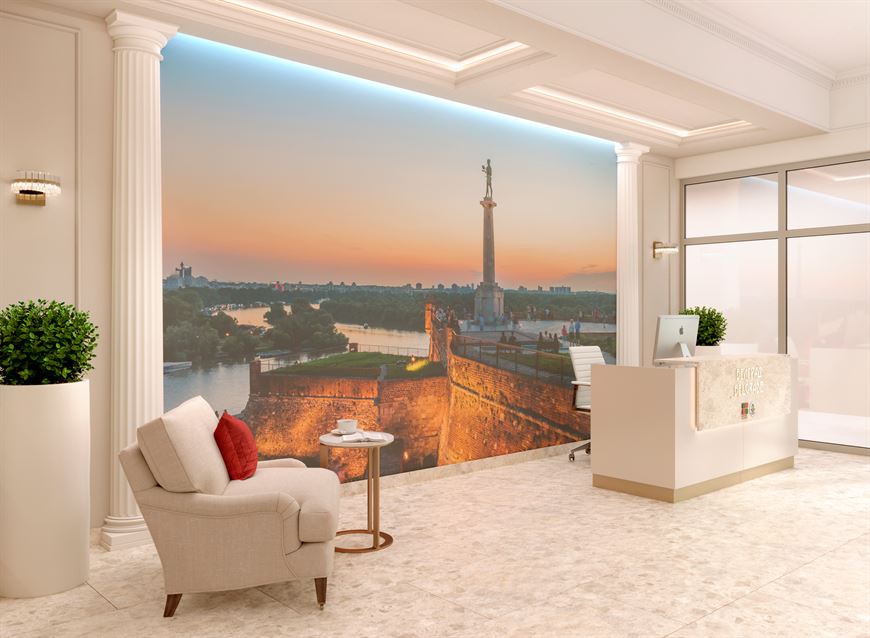 В просторном (47м²) фойе дома "Белград" есть стойка для приветливого консьержа, небольшой букшеринг, а рядом — место для ожидающих вашего прихода гостей. Вестибюль, который имеет высоту потолка 3,6 м, оснащен санитарной комнатой с пеленальным столиком, где мамы смогут позаботиться о комфорте малыша, не возвращаясь домой. Предусмотрен байк-бокс для любителей велоспорта (36 мест) и "паркинг" для детских колясок (14 мест).