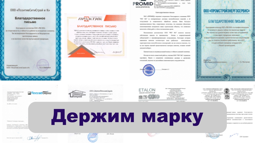 Действуем по принципам продуманной логистики и стратегии "Бережливого производства", знаем и обходим подводные камни при работе со стройками. И нам это удается – 95 % опрошенных заказчиков довольны качеством продукции, работой менеджеров и сроками поставки. Всегда готовы проконсультировать вас по любому вопросу.