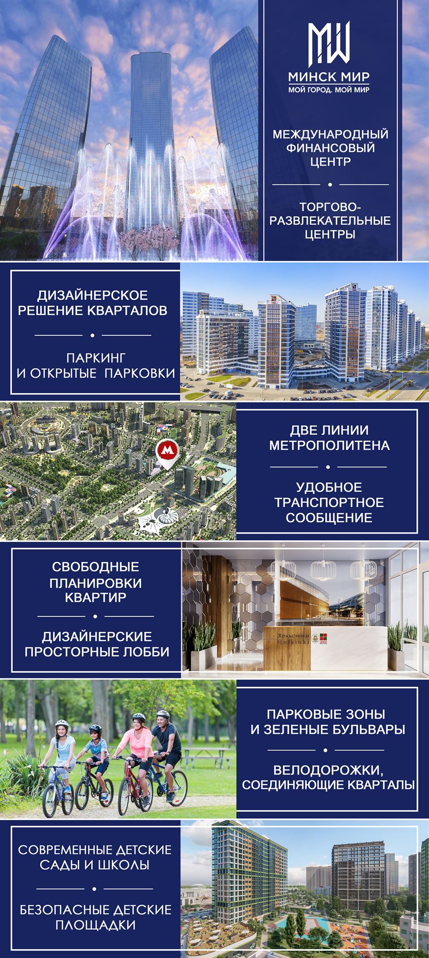 Minsk World – это настоящий город будущего! Удобное расположение практически в центре столицы, развитая транспортная инфраструктура, огромное разнообразие современной жилой, коммерческой и общественной недвижимости создают все условия для комфортной жизни и успешного бизнеса.