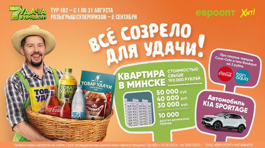 Рекламная игра "Удача в придачу! Тур 180". Срок проведения - с 01.06.2023 г. по 18.08.2023 г. ООО "Яскрава", УНП 191548102. Свидетельство о государственной регистрации № 4316 от 12.05.2023 г., выданное Министерством антимонопольного регулирования и торговли Республики Беларусь. Подробности на сайте evroopt.by или по телефону +375 (17) 388-76-76.