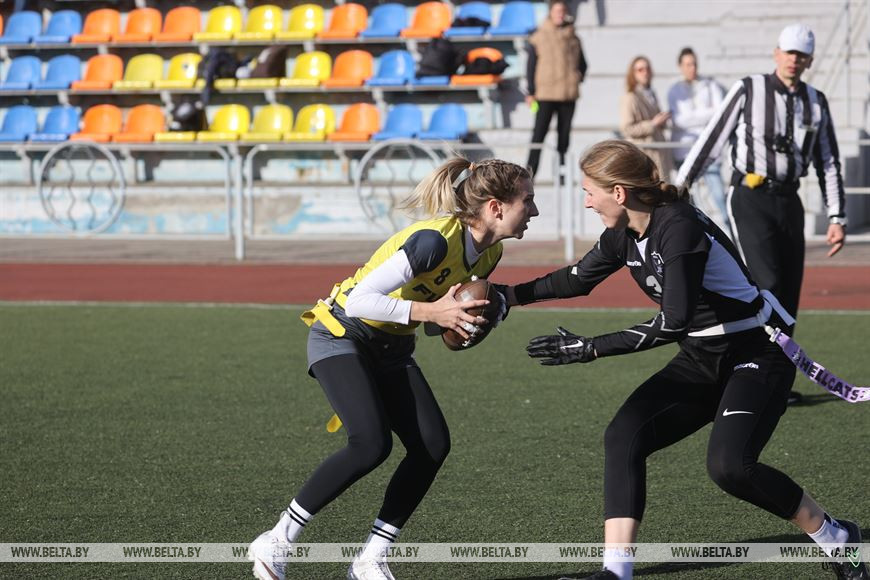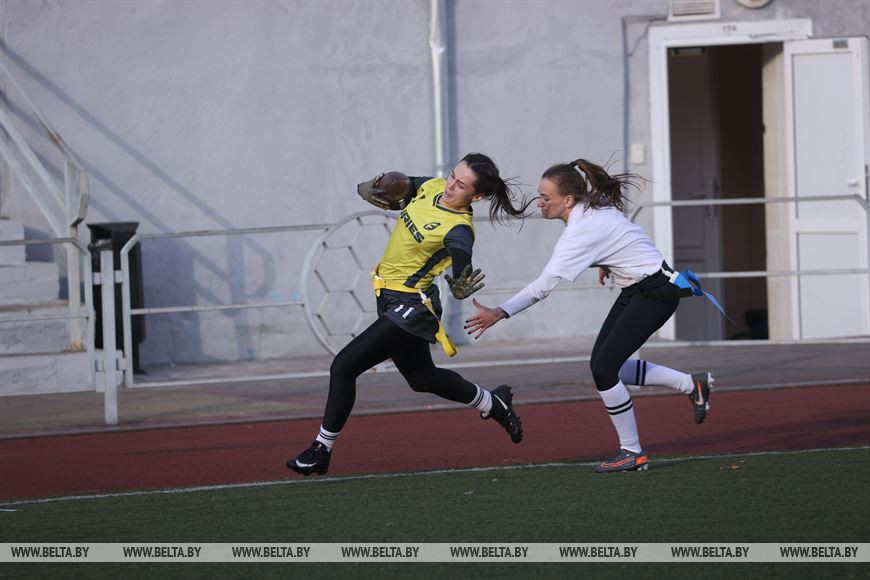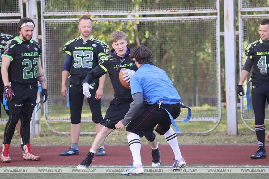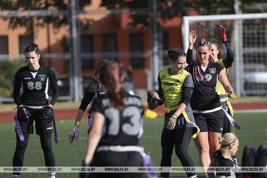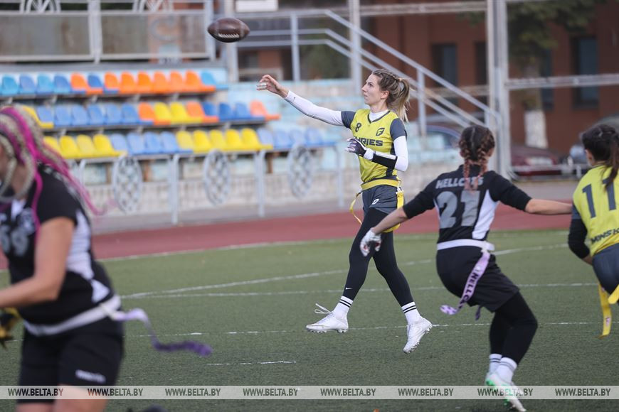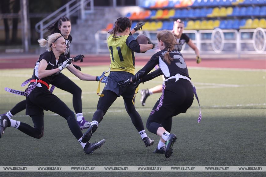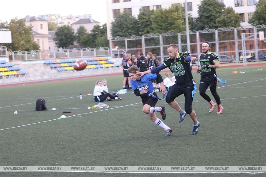 19 сентября, Минск /Корр. БЕЛТА/. В Минске прошел чемпионат Республики Беларусь по флаг-футболу среди мужских и женских команд. Чемпионат проходил на территории учебно-спортивного комплекса БГУ "Университетский". Участие в нем приняли шесть команд, три женские команды и три мужских. Флаг-футбол - это разновидность классического американского футбола.-0-