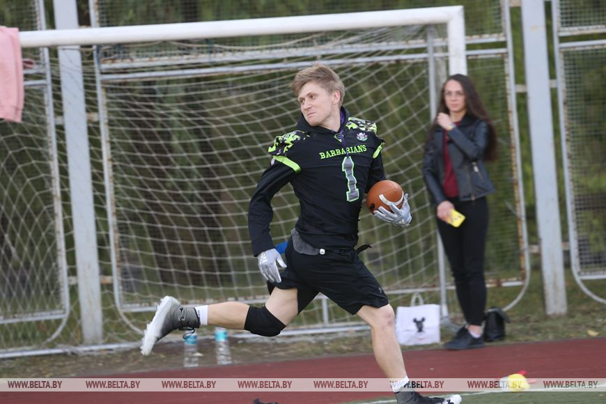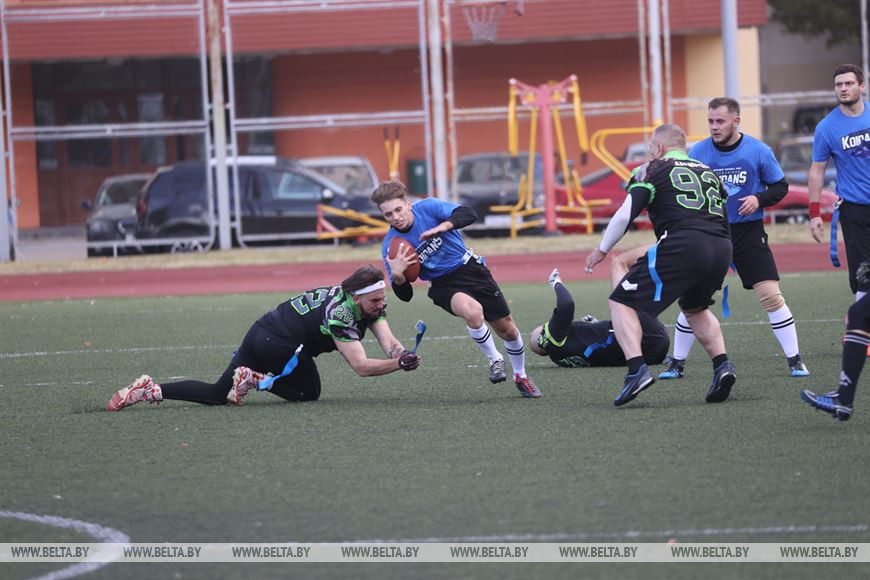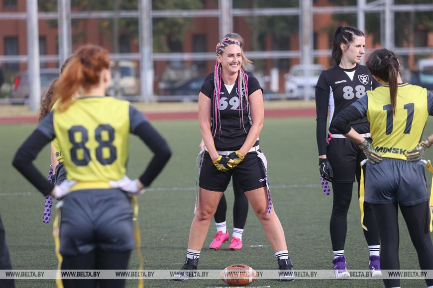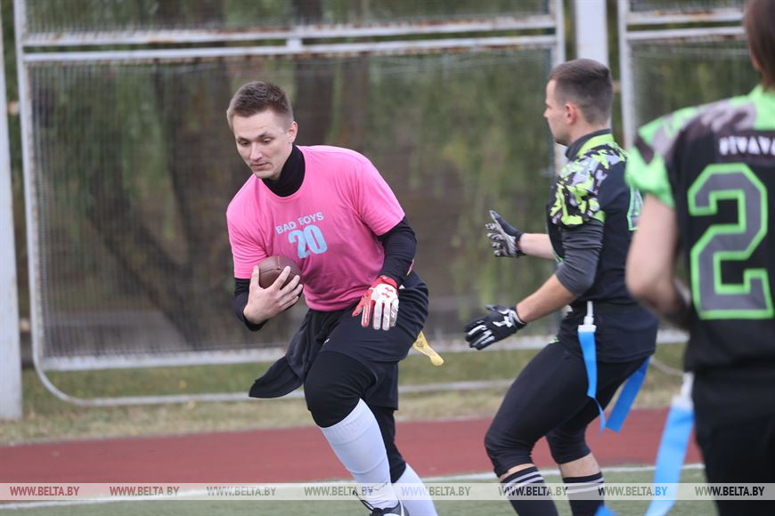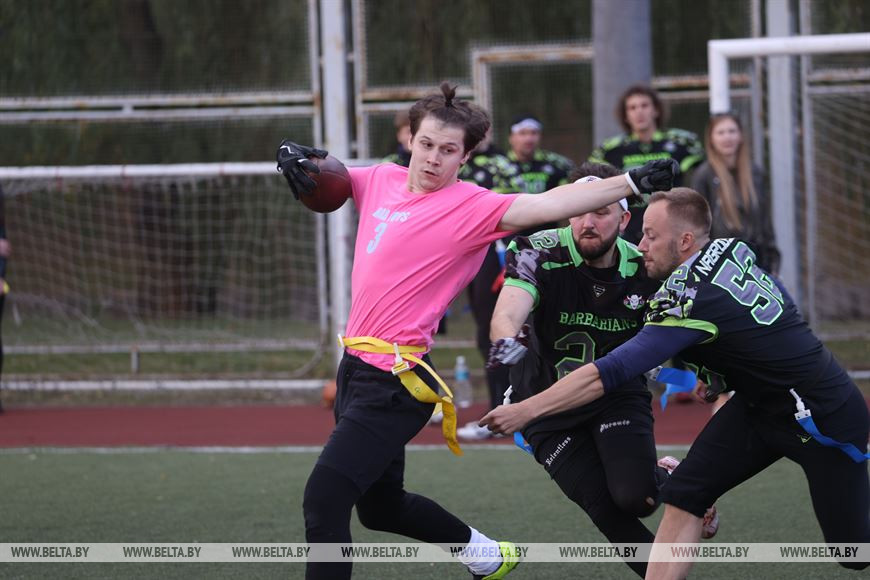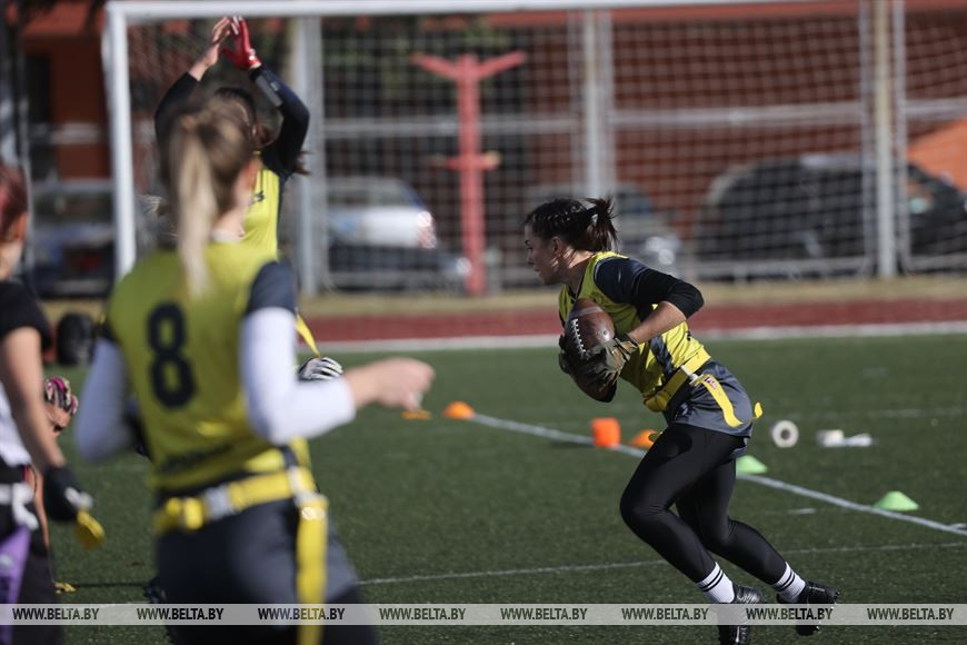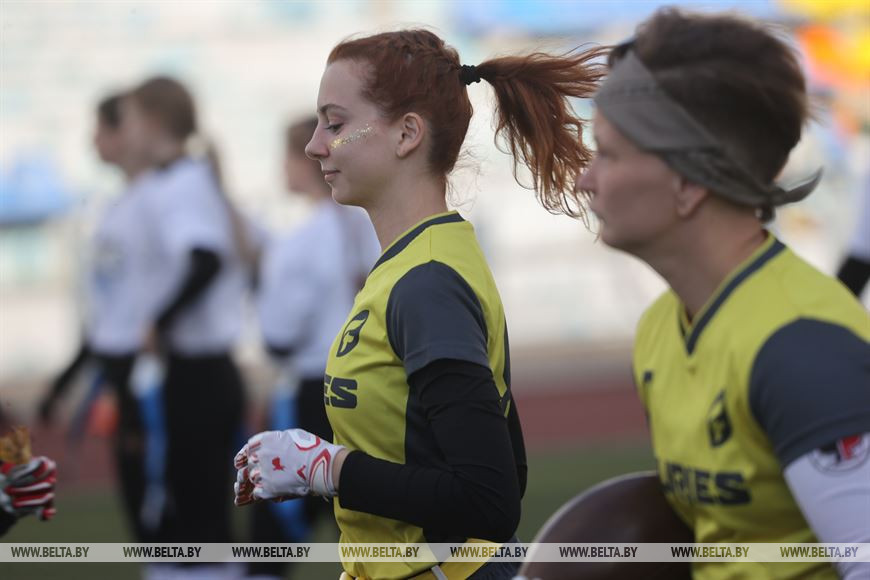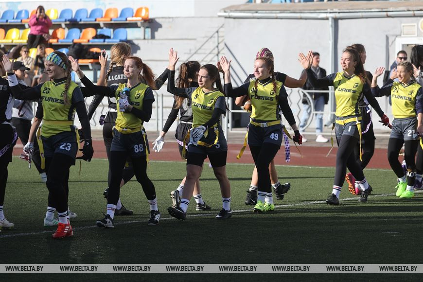 19 сентября, Минск /Корр. БЕЛТА/. В Минске прошел чемпионат Республики Беларусь по флаг-футболу среди мужских и женских команд. Чемпионат проходил на территории учебно-спортивного комплекса БГУ "Университетский". Участие в нем приняли шесть команд, три женские команды и три мужских. Флаг-футбол - это разновидность классического американского футбола.-0-