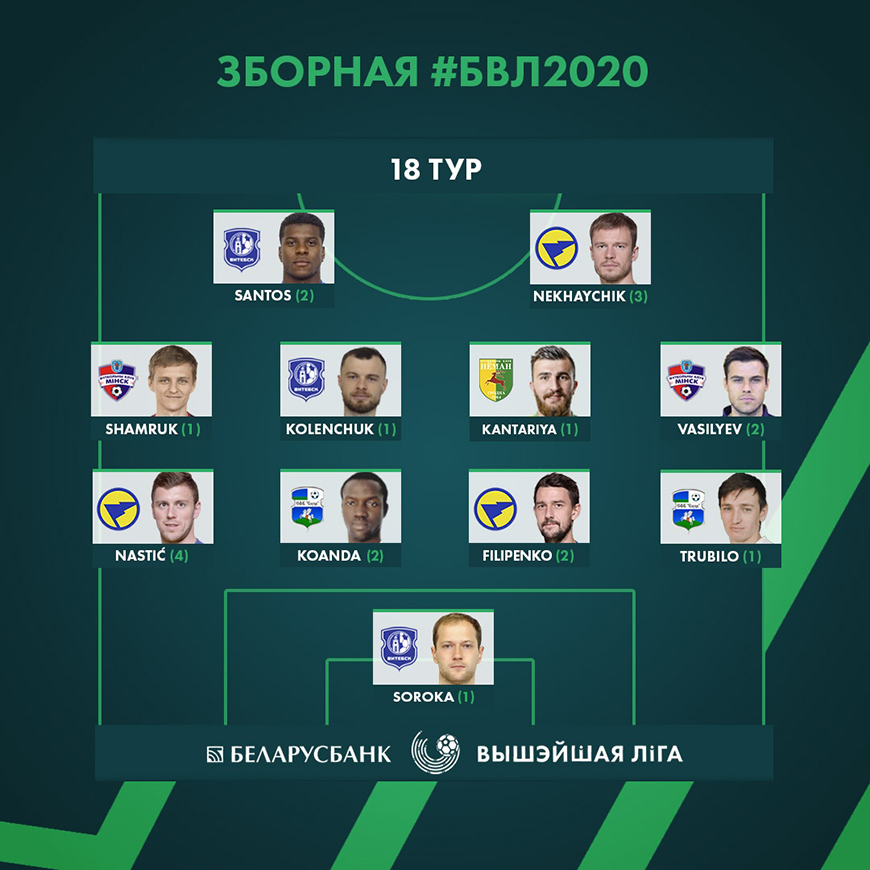 Защитник борисовской дружины Боян Настич в четвертый раз попал в сборную, полузащитник Павел Нехайчик - в третий, защитник Егор Филипенко - во второй. Во второй раз в сборную попал хавбек витебчан Диего Сантос, впервые - его товарищи по команде голкипер Артем Сороко и полузащитник Максим Каленчук. Также в сборной тура по два игрока из "Слуцка" - Виталий Трубило и Сулейман Коанда, "Минска" - Андрей Шамрук и Александр Васильев, а также Григорий Кантария из гродненского "Немана".