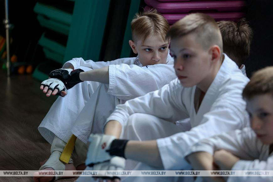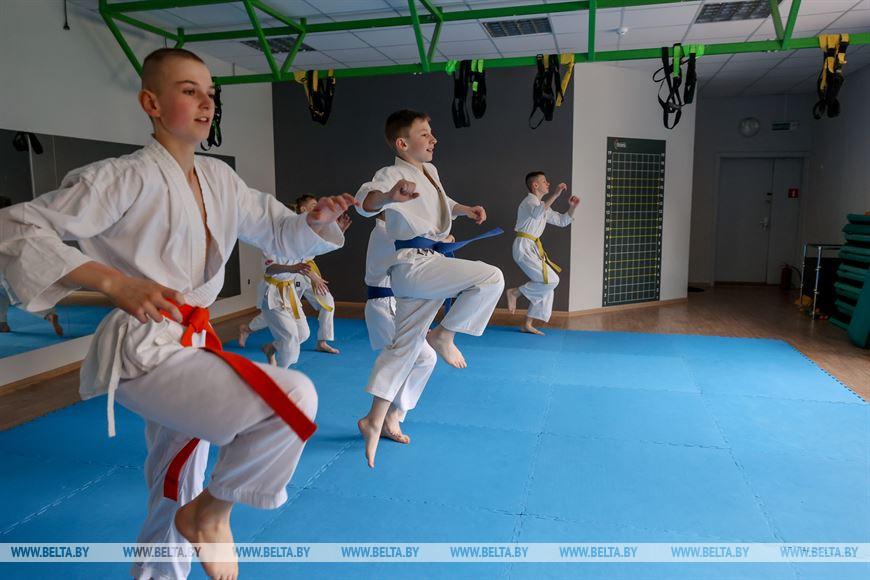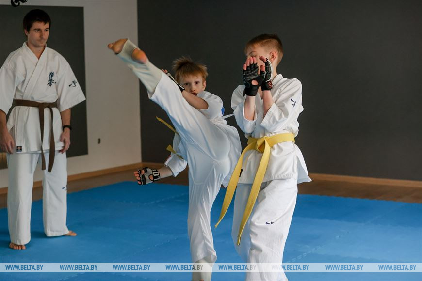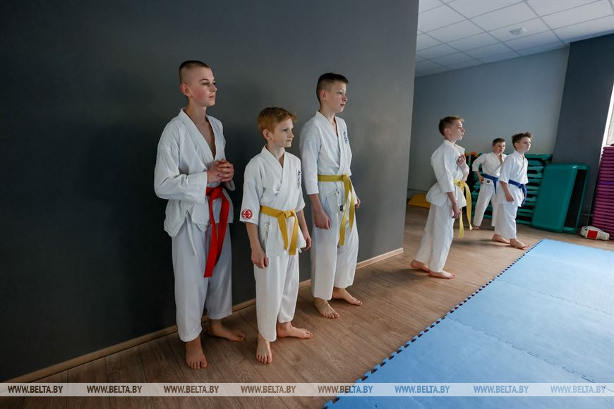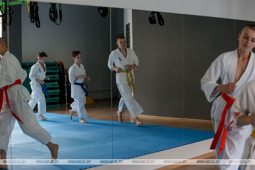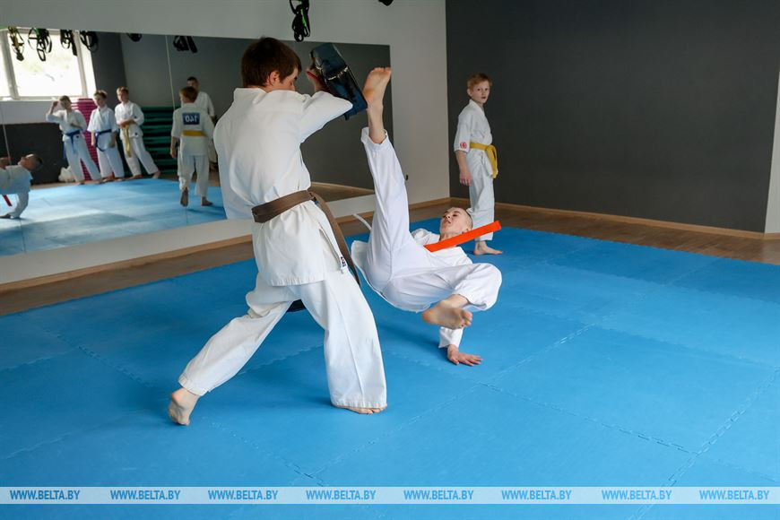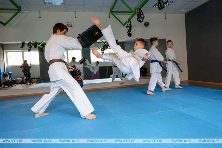 "Это один из самых зрелищных ударных видов спорта, очень популярный. Это работа над собственным телом, хороший способ самообороны и единственный, наверное, вид спорта, из которого уходят в другие виды - ММА, кикбоксинг - и становятся чемпионами. Наоборот - нет. Потому что это очень серьезная, колоссальная база", - перечисляет достоинства выбранного "будо" (пути) Олег Давидовский, тренер-преподаватель школы карате "Кайман". На его занятие в зале фитнес-клуба в Соснах с подрастающими чемпионами корреспонденты БЕЛТА приехали по следам успешного выступления учеников школы на недавнем чемпионате Беларуси.
