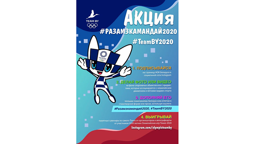 Акция, в которой может поучаствовать каждый желающий, продлится до 8 августа. Необходимо подписаться на страницу НОК Беларуси в Instagram, сделать фото или видео на фоне спортивного объекта или с предметами, которые ассоциируются с олимпийским движением и летними видами спорта. Далее следует дополнить снимок или видео теплыми пожеланиями белорусским атлетам в стихотворной форме или прозе, используя официальные хештеги #Разамзкамандай2020, #TeamBY2020, и разместить у себя на странице, отметив @olympicteamby.