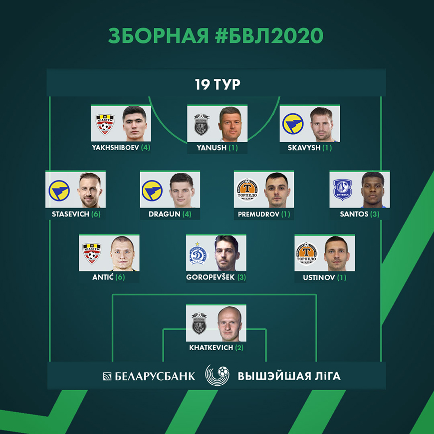 Капитан борисовской дружины полузащитник Игорь Стасевич уже в шестой раз в сезоне попал в сборную. Он же признан лучшим игроком минувшего тура. Полузащитник БАТЭ Станислав Драгун в четвертый раз включен в команду тура, нападающий Максим Скавыш - впервые. В символической сборной еще по два представителя "Шахтера" - Джасурбек Яхшибоев и Никола Антич, "Ислочи" - Николай Януш и Егор Хаткевич, "Торпедо-БелАЗа" - Кирилл Премудров и Виталий Устинов. Также в символическую сборную вошли Миха Горопевшек ("Динамо", Минск) и Диего Сантос ("Витебск").