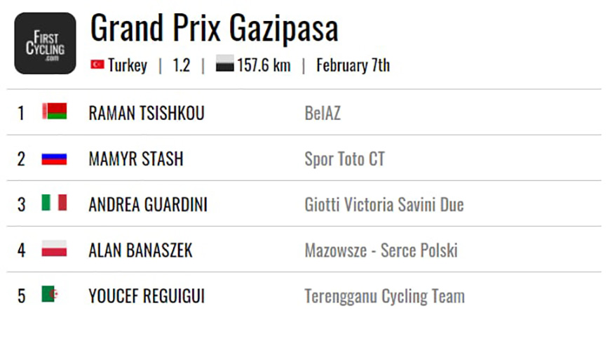 8 февраля, Минск /Корр. БЕЛТА/. Представитель новой белорусской велокоманды "БЕЛАЗ" Роман Тишков стал победителем Гран-при Газипаши в Турции, сообщает корреспондент БЕЛТА.
