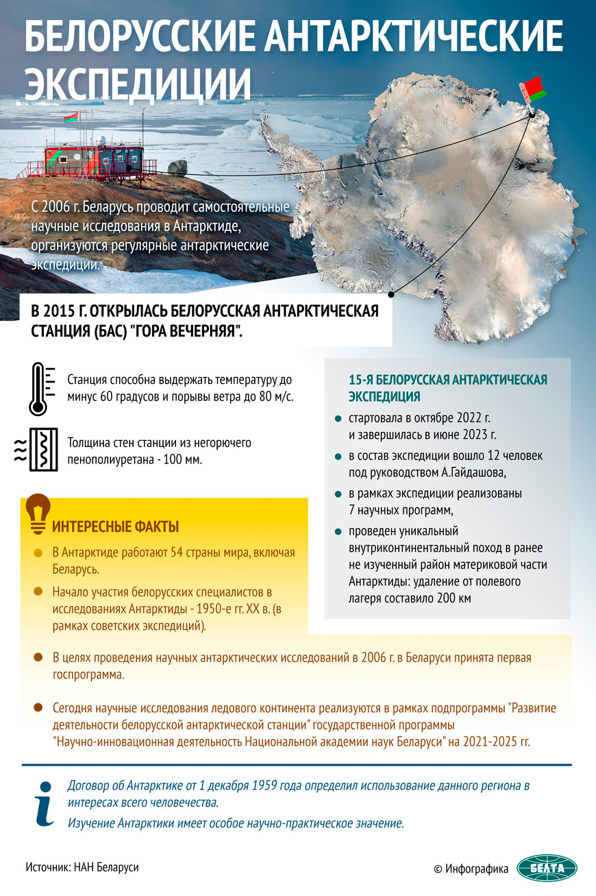 В 2007 году на ледовый континент отправилась первая национальная экспедиция из Беларуси. Задача перед нашими полярниками стояла провести геофизические исследования атмосферы. Эта работа проводилась в рамках первой государственной программы по Антарктиде - "Мониторинг полярных районов Земли и обеспечение деятельности арктических и антарктических экспедиций на 2007-2010 годы и на период до 2015 года".