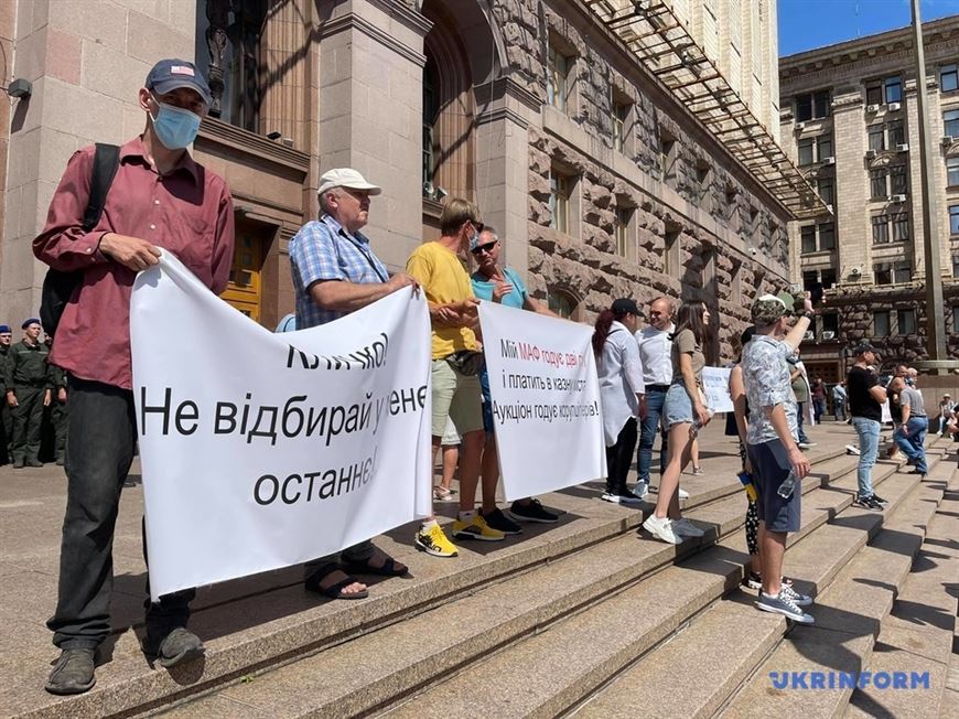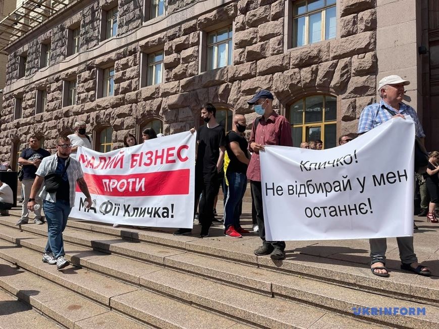 Предприниматели выступают против проекта решения Киевсовета "О некоторых вопросах размещения временных сооружений торгового, бытового, социально-культурного или другого назначения для осуществления предпринимательской деятельности в Киеве". Они протестуют против новых правил размещения МАФов (малых архитектурных форм. - Прим. БЕЛТА). Участники акции держат плакаты: "Малый бизнес против мафии Кличко", "Кличко, не отбирай у меня последнее", "Господин президент, помогите спасти бизнес от мафии Кличко".
