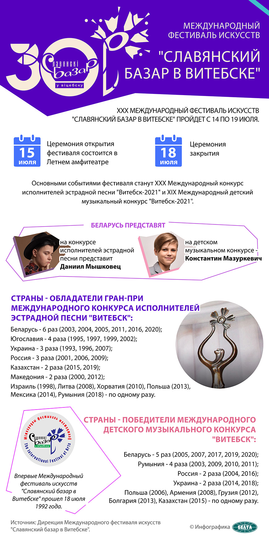 XXX Международный фестиваль искусств "Славянский базар в Витебске" проходит с 15 по 18 июля, вчера форум был официально открыт. Закроют фестиваль гала-концертом с награждением победителей конкурсов 18 июля. Жюри взрослого конкурса возглавит народный артист Беларуси Анатолий Ярмоленко, детского - певец Филипп Жмахер (Сербия). В фестивале принимают участие представители 33 стран.-0-