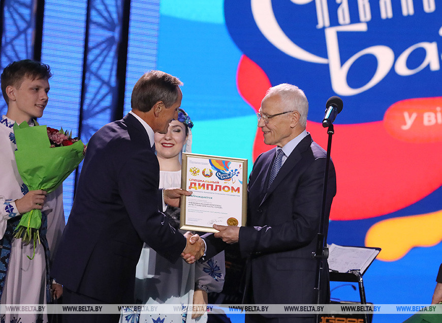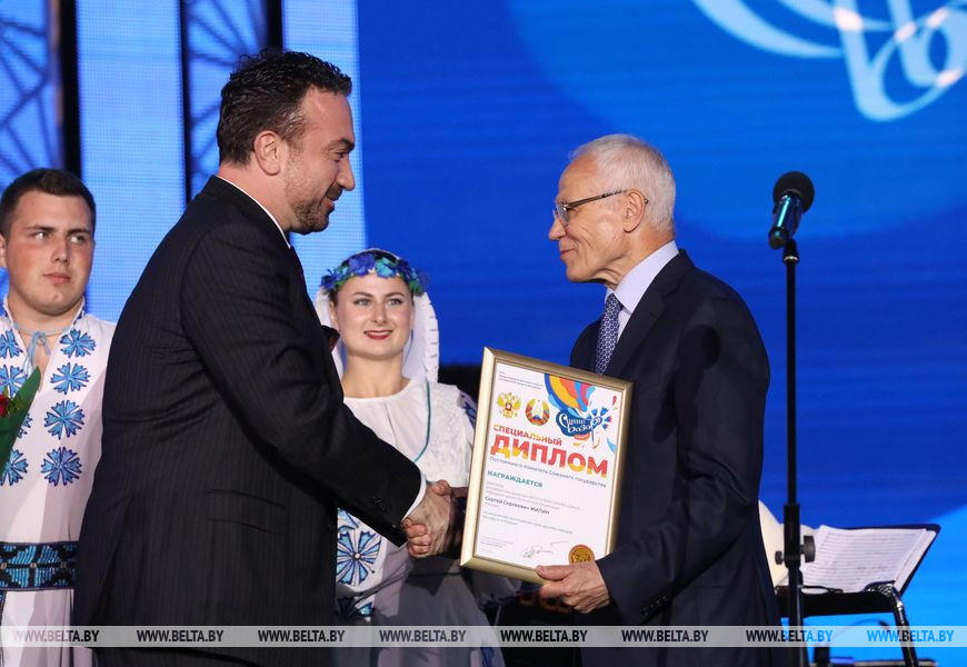 Затем прошла церемония награждения дипломами Постоянного комитета Союзного государства за творческое воплощение идеи дружбы народов Беларуси и России. За большой вклад в укрепление белорусско-российских связей награды удостоен руководитель оркестра "Фонограф-Симфо-Джаз" (Россия) Сергей Жилин. Коллектив мемориального комплекса "Брестская крепость-герой" награжден за реставрацию и музеефикацию сооружений Брестской крепости при поддержке Союзного государства. Свой диплом за активное исследование белорусско-российских литературных связей получили сотрудники музея Максима Богдановича. За участие в проекте Союзного государства по созданию Ржевского мемориала Советскому солдату и проведение мероприятий к 75-летию Великой Победы наградили директора Центрального музея Великой Отечественной войны 1941-1945 годов (Россия) Александра Школьника. Он не смог приехать - награду вручат в ближайшее время.