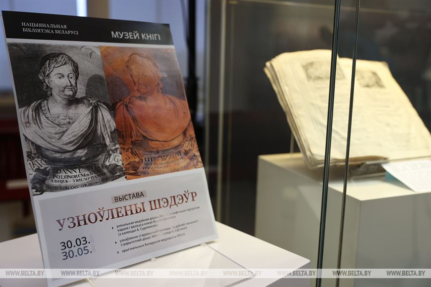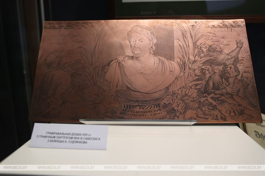 На выставке также демонстрируется воссозданная на основе доски по старинной технологии гравюра с портретом короля и великого князя Яна III Собеского. К большому сожалению, история была беспощадной к белорусской культуре, и до нашего времени не сохранилось почти ни одной оригинальной доски, из которой наши предки делали великолепные гравюры XVI-XVIІI веков. "Благодаря известному библиофилу, коллекционеру гравюр и экслибрисов Олегу Судленкову мы сегодня имеем уникальную возможность показать и саму доску, и технологию печати", - продолжил Александр Суша.