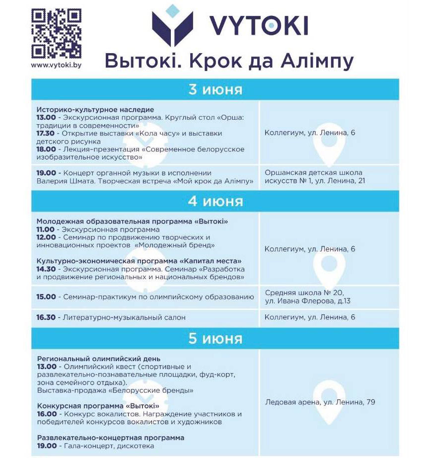 Фестиваль откроется 3 июня программой историко-культурного наследия в оршанском Иезуитском коллегиуме (ул.Ленина, 6). В этот день здесь состоится круглый стол на тему "Орша: традиции в современности" (начало в 13.00), а также открытие выставок "Кола часу" и детского рисунка (17.30) и лекция-презентация "Современное белорусское изобразительное искусство" (18.00). В детской школе искусств №1 (ул.Ленина, 21) пройдет концерт органной музыки и творческая встреча Валерия Шмата "Мой крок да Алiмпу"(19.00).