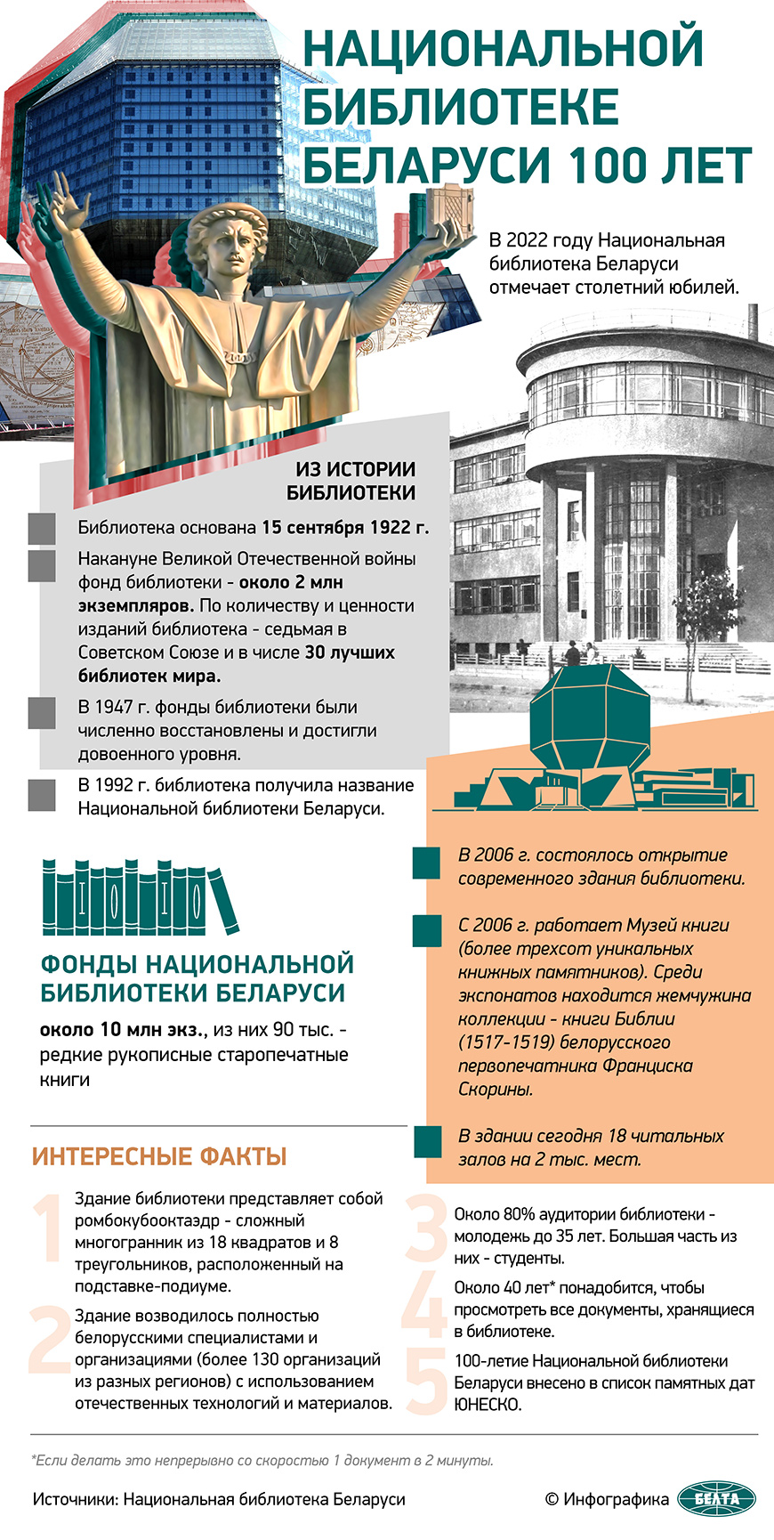 Он отметил, что 1922 год, когда НББ была основана (тогда Белорусская государственная и университетская библиотека. - Прим. БЕЛТА), - время, когда происходило становление советской власти. "Денег нет, ресурсов нет, но советская власть делает все, чтобы библиотека была в Беларуси, - заметил Игорь Луцкий. - 2002 год, когда Президент принял решение о строительстве этого замечательного здания. Практически за четыре года всем народом мы сделали невозможное. Именно в Год исторической памяти мне бы хотелось, чтобы все помнили эти даты и все то, что мы вместе сделали для сохранения нашего наследия и нашей библиотеки".
