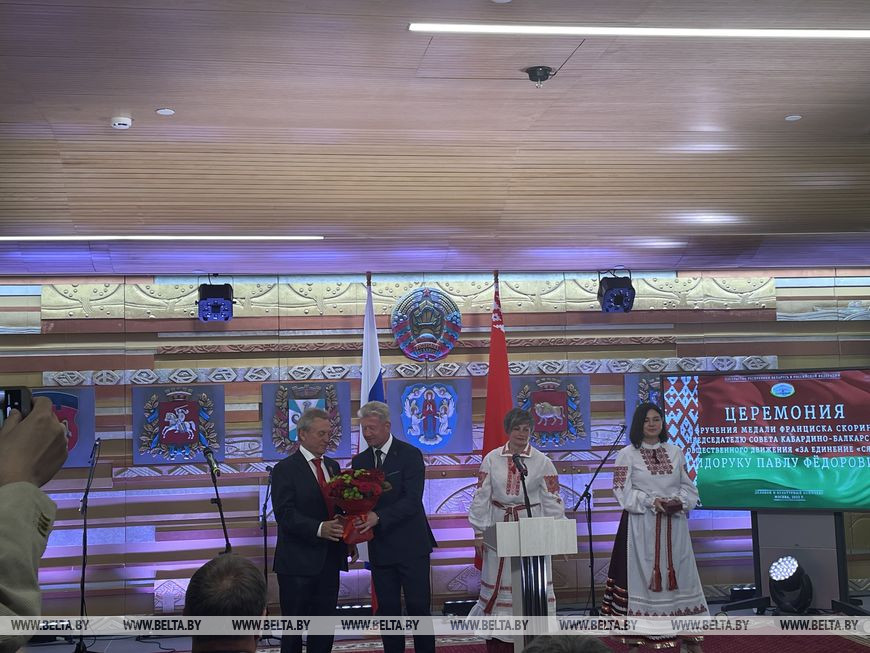 Медаль Франциска Скорины министр вручил руководителю Кабардино-Балкарского общественного движения "За единение "Сябры" Павлу Сидоруку. В соответствии с указом Президента Беларуси Александра Лукашенко этой награды он удостоен за значительный личный вклад в сохранение и популяризацию культурного наследия белорусского народа.