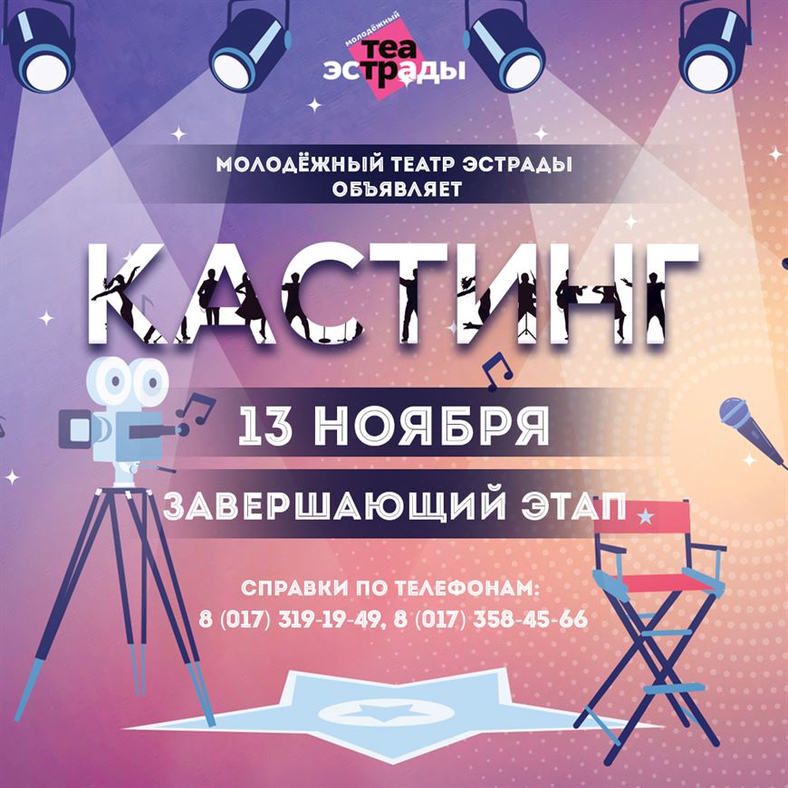 "Молодежный театр эстрады является стартовой площадкой для большого числа звезд белорусской эстрады. Важной миссией остается поиск и развитие новых талантов. Одним из ведущих направлений нашей работы являются мастер-классы, кастинги, организация работы творческих студий. В стенах театра постоянно проходит отбор новых артистов и уже 13 ноября состоится очередной завершающий этап кастинга актеров, исполнителей, композиторов, авторов литературных произведений и артистов разговорного жанра, - рассказали в театре. - "Желаем удачи всем конкурсантам, главное не робеть" - таким призывом поддерживают именитые артисты театра начинающих".